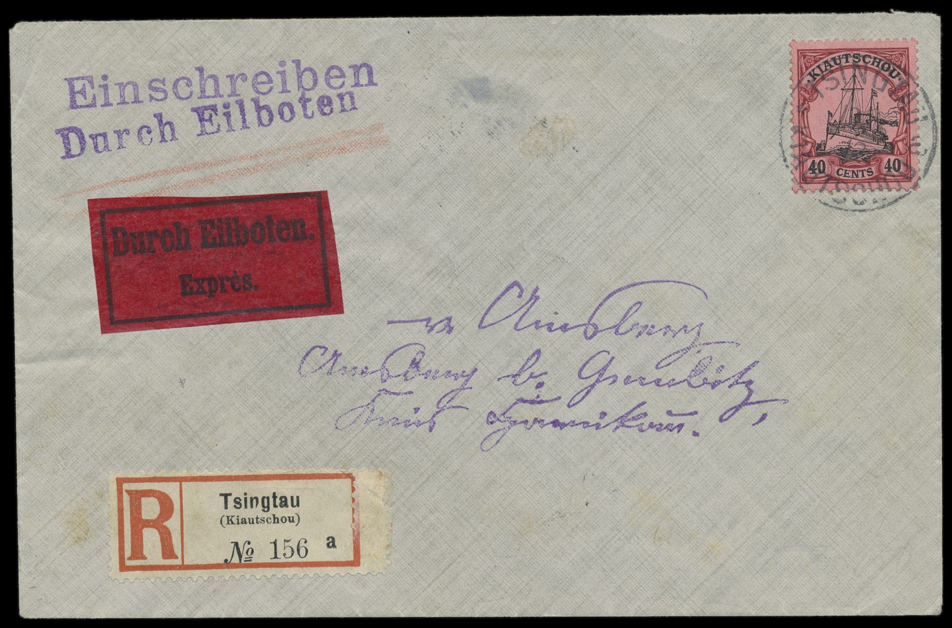 Einzelfrankatur 40 C. auf Eilboten-Einschreibbrief nach Deutschland, Stempel Tsingtau a 13.6.1912, R-Zettel mit UB a, Einfeldt Nr. 13 I, Ankunftstempel Gembitz 30.6.12