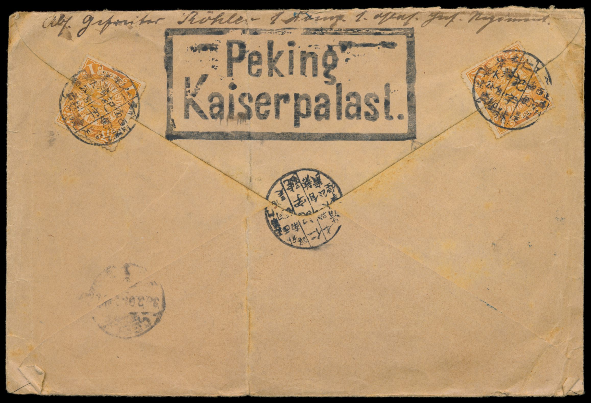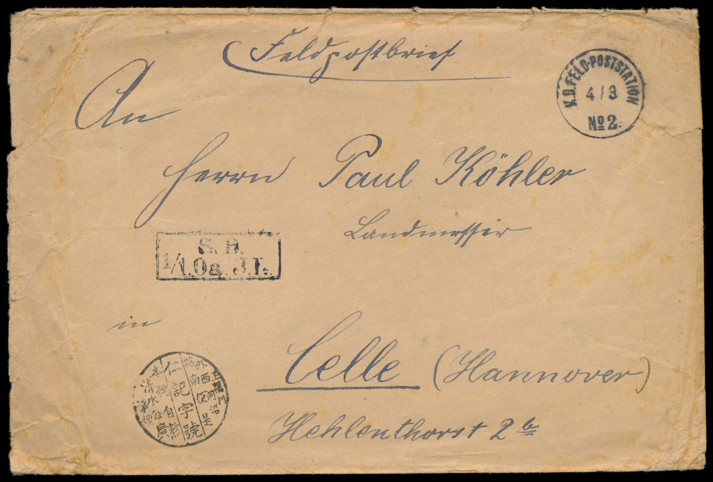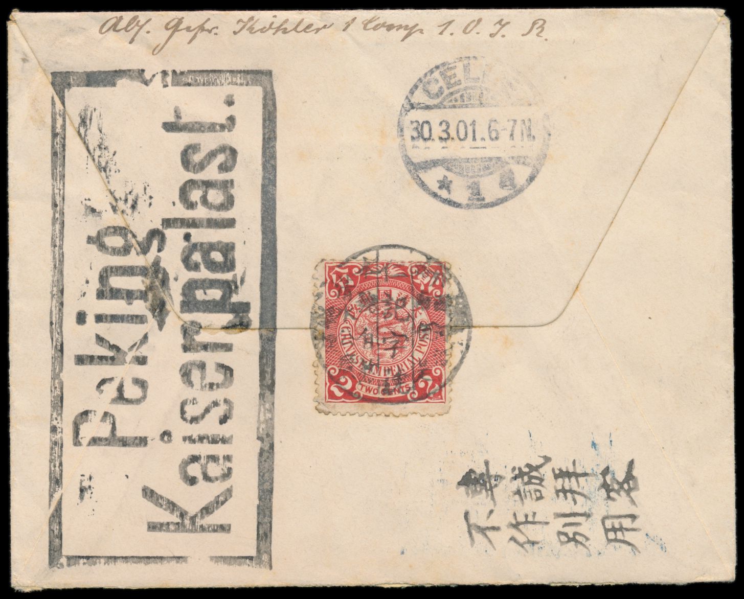 Feldpostbrief mit Stempel Peking 4.3.01 nach Celle, R2 S.B. 1/1. Oa. J.R., rückseitig handschriftliche Absenderangabe "Gefr. Köhler ..." und 2 x Rahmenstempel Peking / Kaiserpalast, Format 62 x 27 mm (Holzstempel), zusätzlich chinesische Stempel (nicht postalisch) als Dekoration, Ankunftstempel Celle 13.4.01, leichte Beförderungsspuren, Bedarf