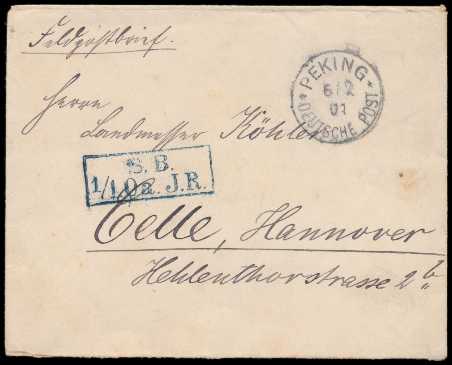 Feldpostbrief mit Stempel Peking 6.2.01 nach Celle, blauer R2 S.B. 1/1. Oa. J.R., rückseitig handschriftliche Absenderangabe "Gefr. Köhler ..." und großer Rahmenstempel Peking / Kaiserpalast, Format 83 x 37 mm (Holzstempel), dazu eine China-Briefmarke 2 C. entwertet mit chinesischem Kreisstempel und weiterer chinesischer Zeilenstempel (beide nicht postalisch, Souvenir), Ankunftstempel Celle 30.3.01, Bedarf