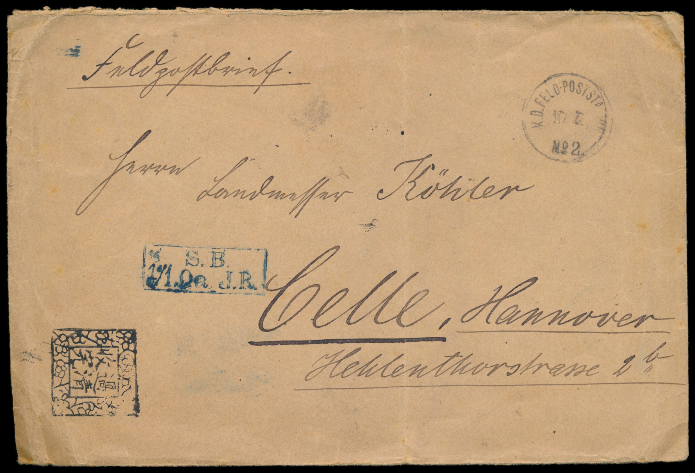 Feldpostbrief mit Stempel Peking 17.2.01 nach Celle, blauer R2 S.B. 1/1. Oa. J.R., rückseitig handschriftliche Absenderangabe "Gefr. Köhler ..." und großer Rahmenstempel Peking / Kaiserpalast, Format 83 x 37 mm (Holzstempel), rückseitig ebenfalls zwei China-Briefmarken 1 C., entwertet mit chinesischem Kreisstempel (nicht postalisch, Souvenir), Ankunftstempel Celle 30.3.01, senkrechter Bug, Bedarf