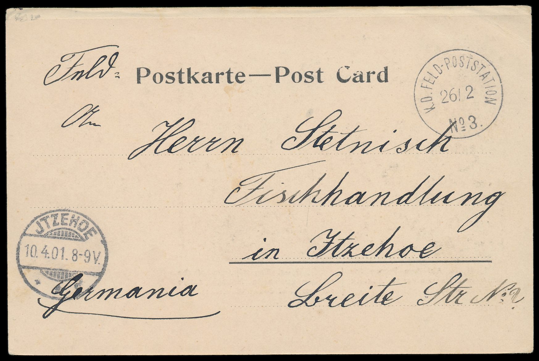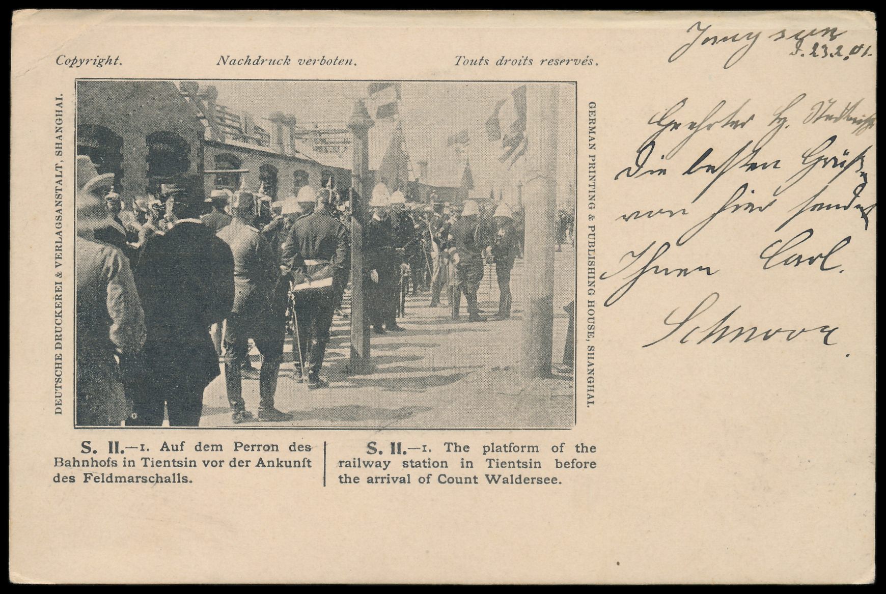 Stempel K. D. Feld-Poststation No. 3 26.2.(01) in Yangtsun auf Ansichtskarte "Auf dem Perron des Bahnhofs in Tientsin vor der Ankunft des Feldmarschalls", Verlag Deutsche Druckerei & Verlagsanstalt, Shanghai, nach Itzehoe, Ankunftstempel 10.4.01, Bedarf