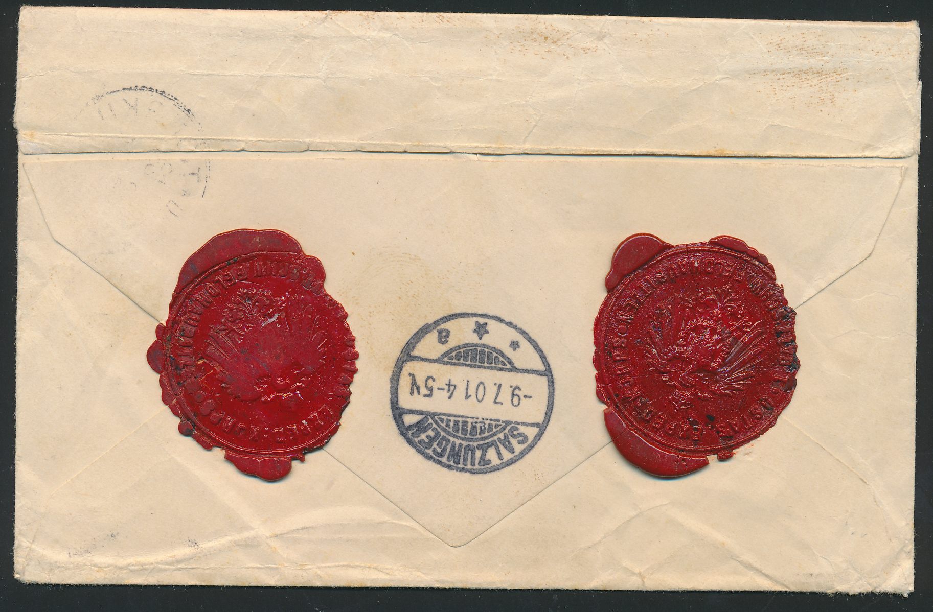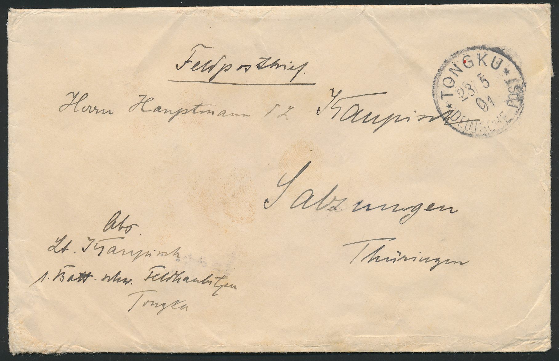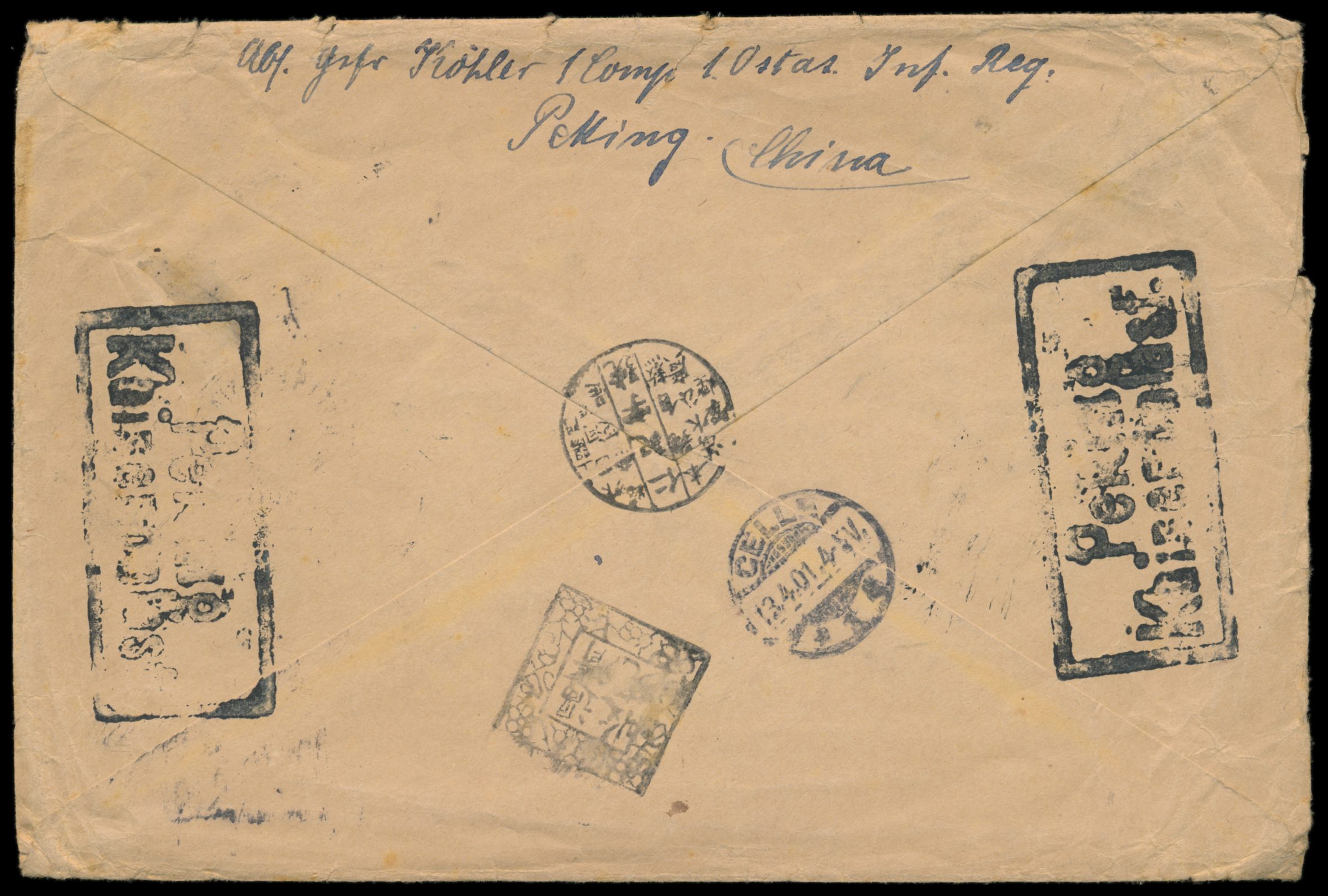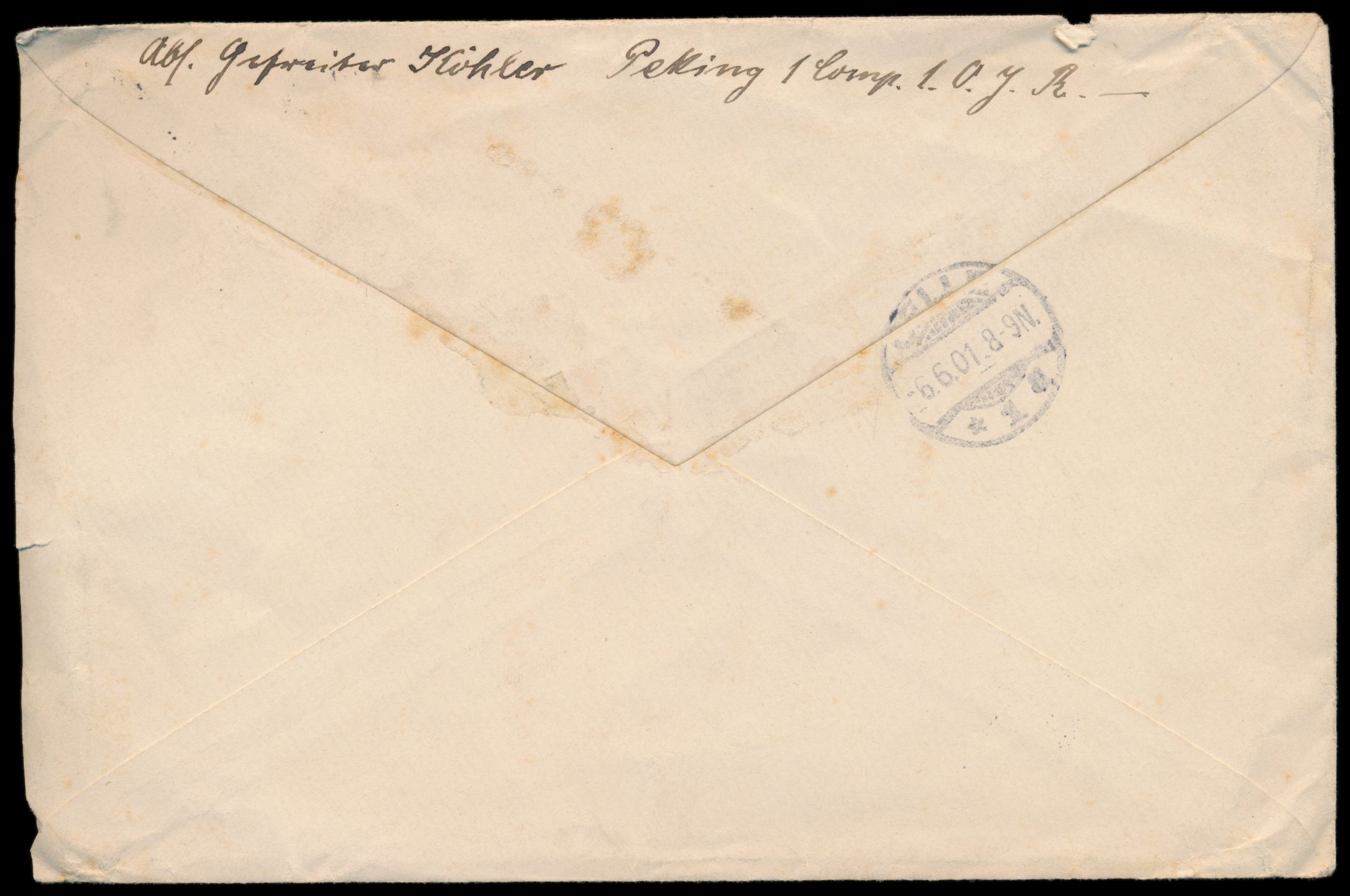 Feldpostbrief mit Stempel Tongku 23.5.01 nach Deutschland, rückseitig zwei rote Lacksiegel "Ostas. Exped. Korps 1. Batt. schw. Feldhaubitzen", Ankunftstempel Salzungen 9.7.01, Bedarf