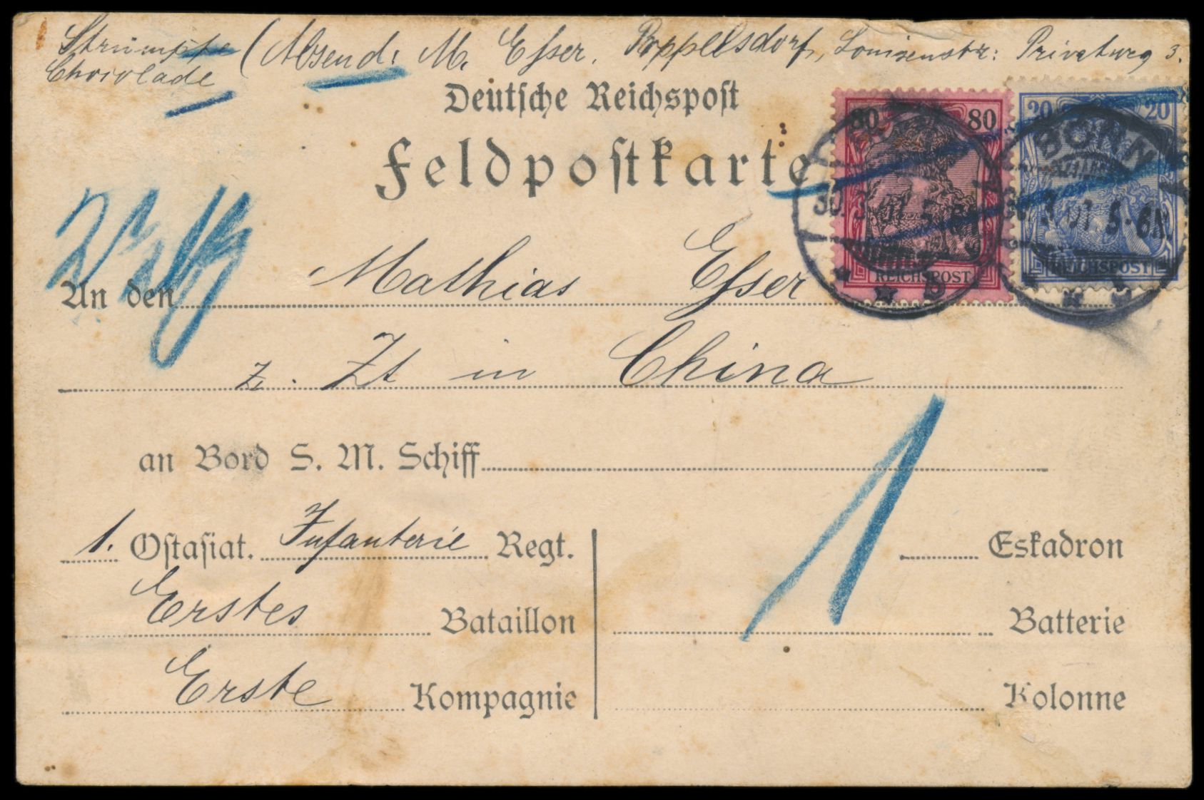 20 Pf. und 80 Pf. auf Feldpost-Vordruckkarte als Paketadresse für ein Feldpostpaket nach China, Stempel Bonn 30.3.01, handschriftliche Gewichtsangabe 2 1/2 Kg, ungewöhnliche Frankatur-Kombination, gering fleckig, Bedarf, Stempelkatalog 500