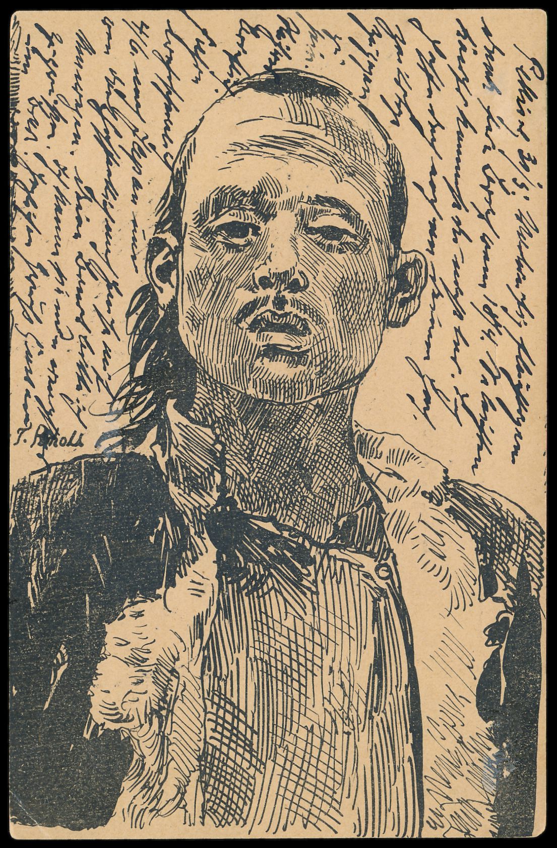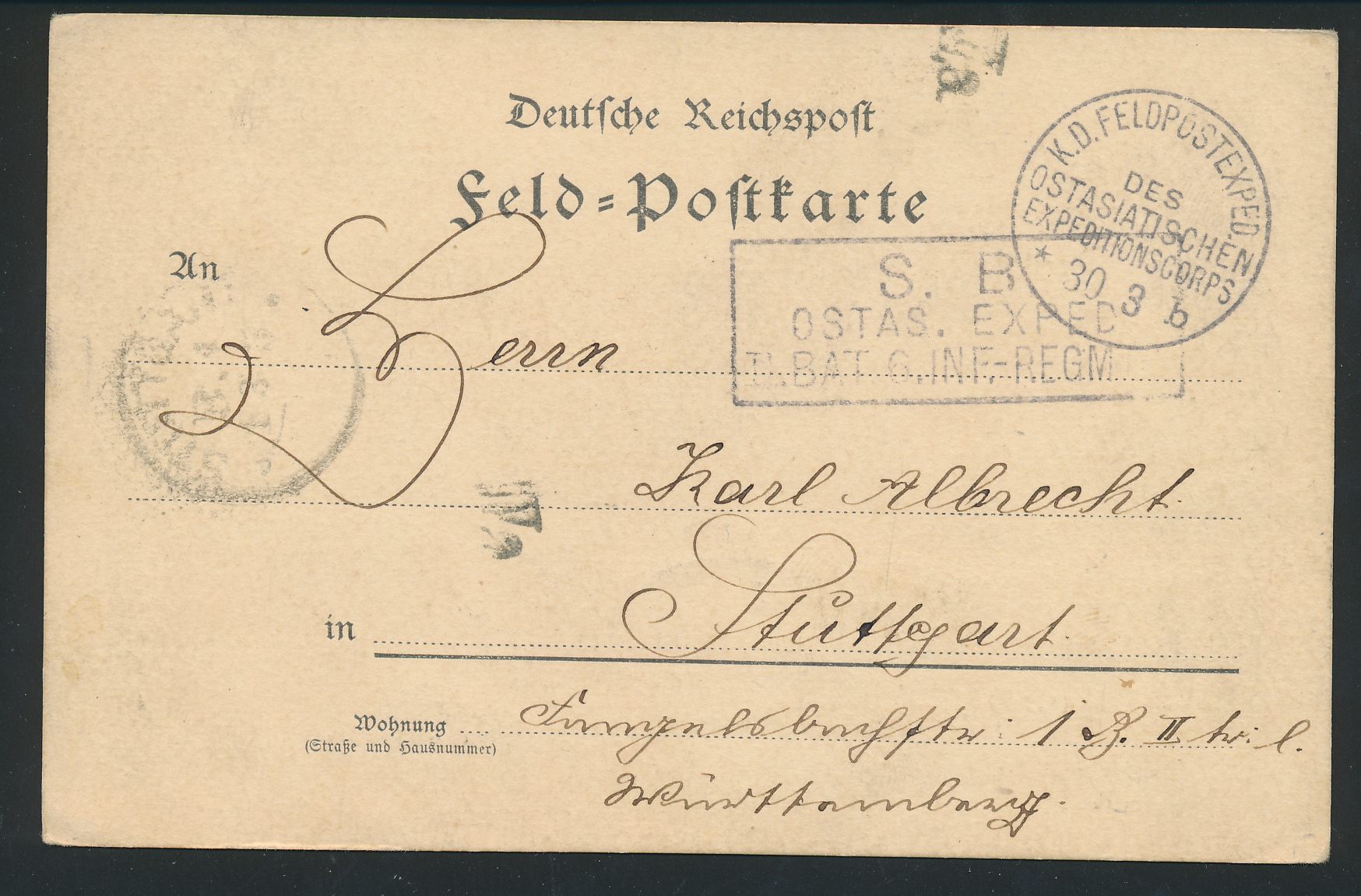 Stempel K. D. Feldpostexped. des Ostasiatischen Expeditionscorps b 30.3. und violetter R3 S. B. / Ostas. Exped. / I. Bat. 6. Inf.-Regmts. auf Feldpost-Vordruckkarte nach Stuttgart, rückseitig einfache Tuschezeichnung des Absenders, Ankunftstempel 3.5.00, Bedarf