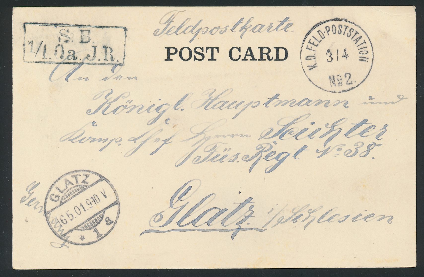 Stempel K. D. Feld-Poststation No. 2 3.4.(01) und schwarzer R2 S. B. / 1/1. Oa.J.R. auf Ansichtskarte Peking nach Glatz, Ankunftstempel 16.5.01, Bedarf
