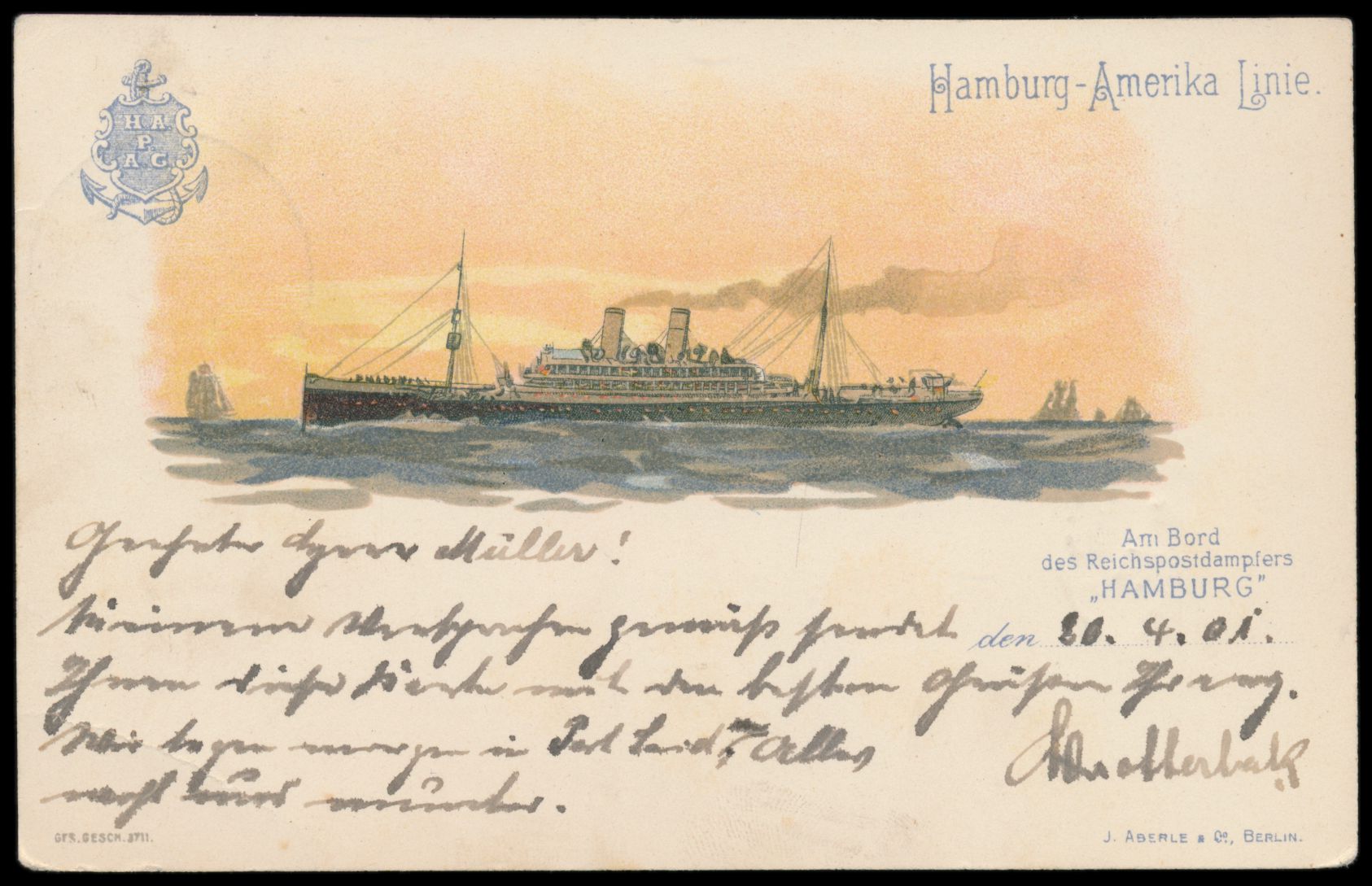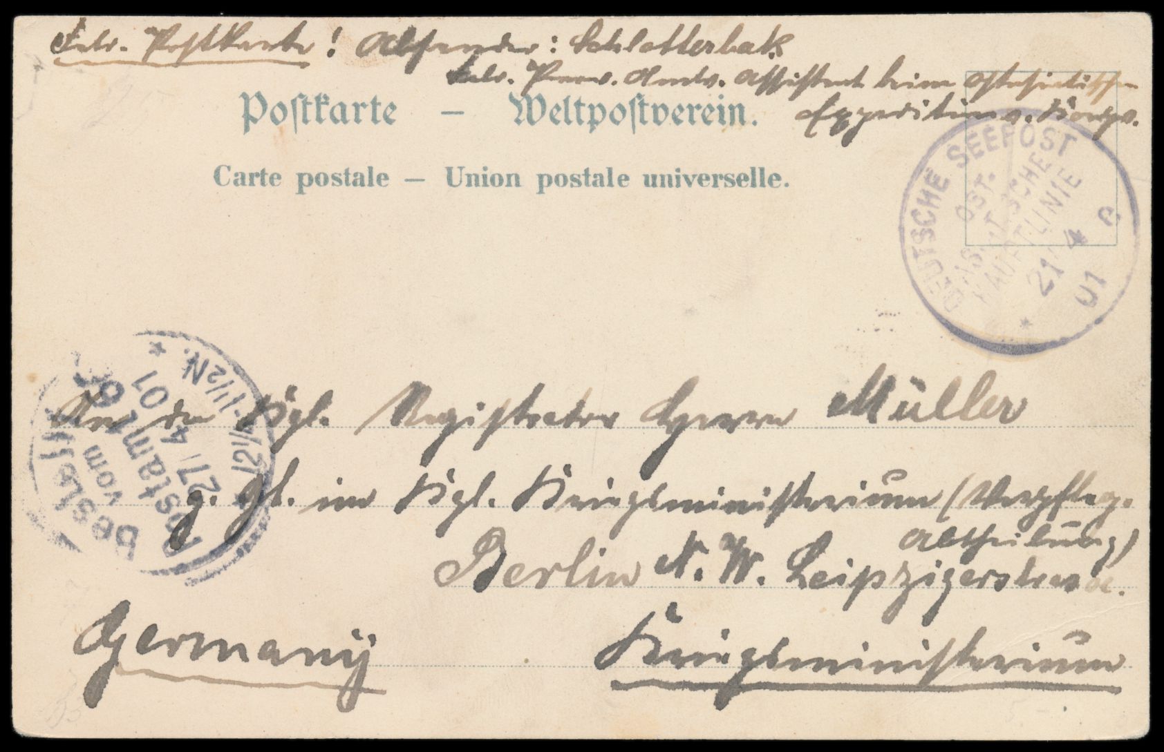 Stempel Deutsche Seepost Ost-Asiatische Hauptlinie * e 21.4.01, Dampfer Hamburg in Port Said, auf dekorativer Litho-Ansichtskarte des Dampfers nach Berlin, Feldpost von der Ausreise nach China (laut Arge-Stempelkatalog bisher nur von der Heimreise belegt) mit vorderseitiger Absenderangabe, Ankunftstempel 27.4.01, Bedarf