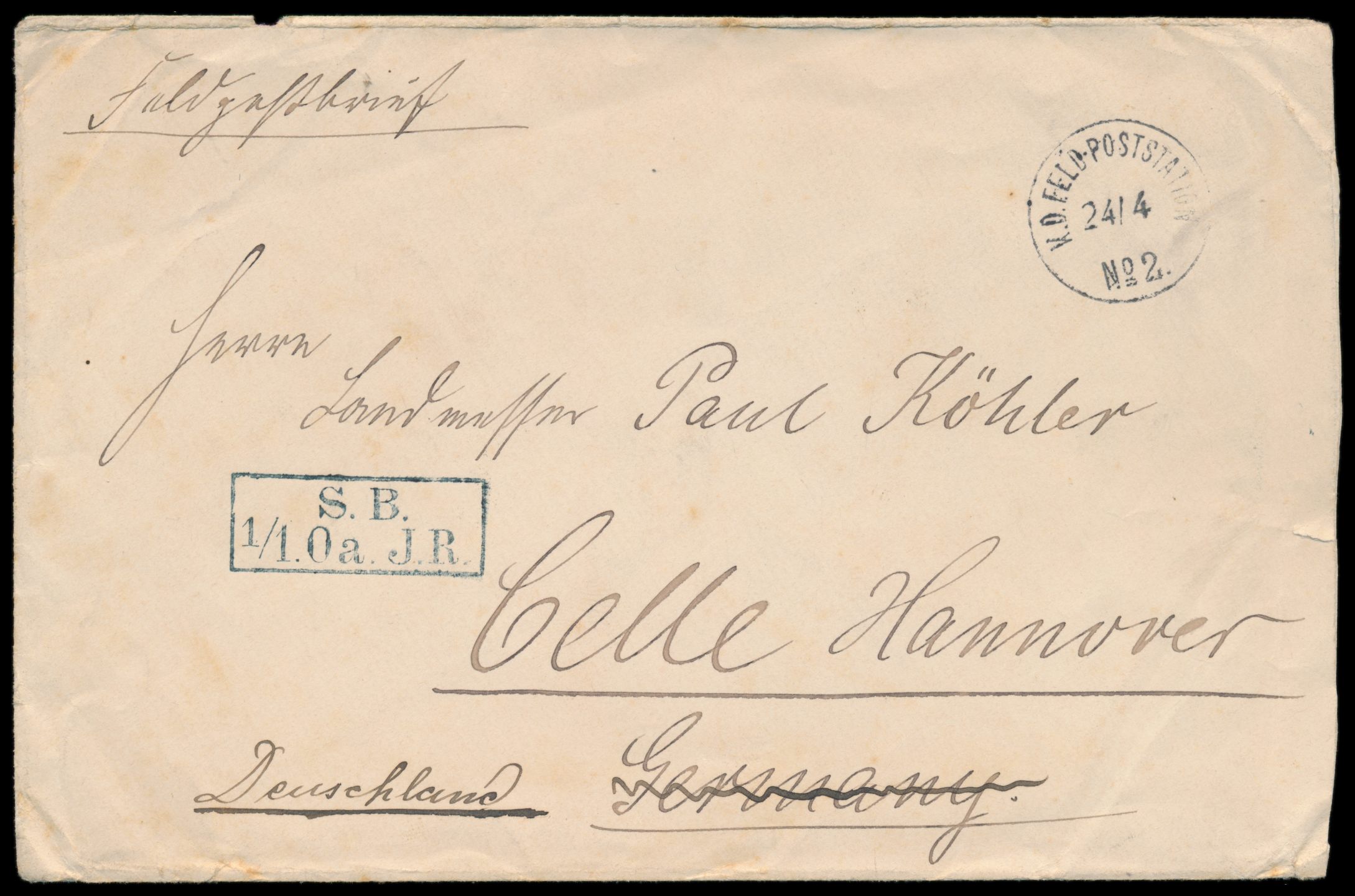 Feldpostbrief mit Stempel Peking 24.4.01 nach Celle, blauer R2 S.B. 1/1. Oa. J.R., untergebracht im Kaiserpalast , rückseitig handschriftliche Absenderangabe "Gefr. Köhler ...", Ankunftstempel Celle 6.6.01, Bedarf