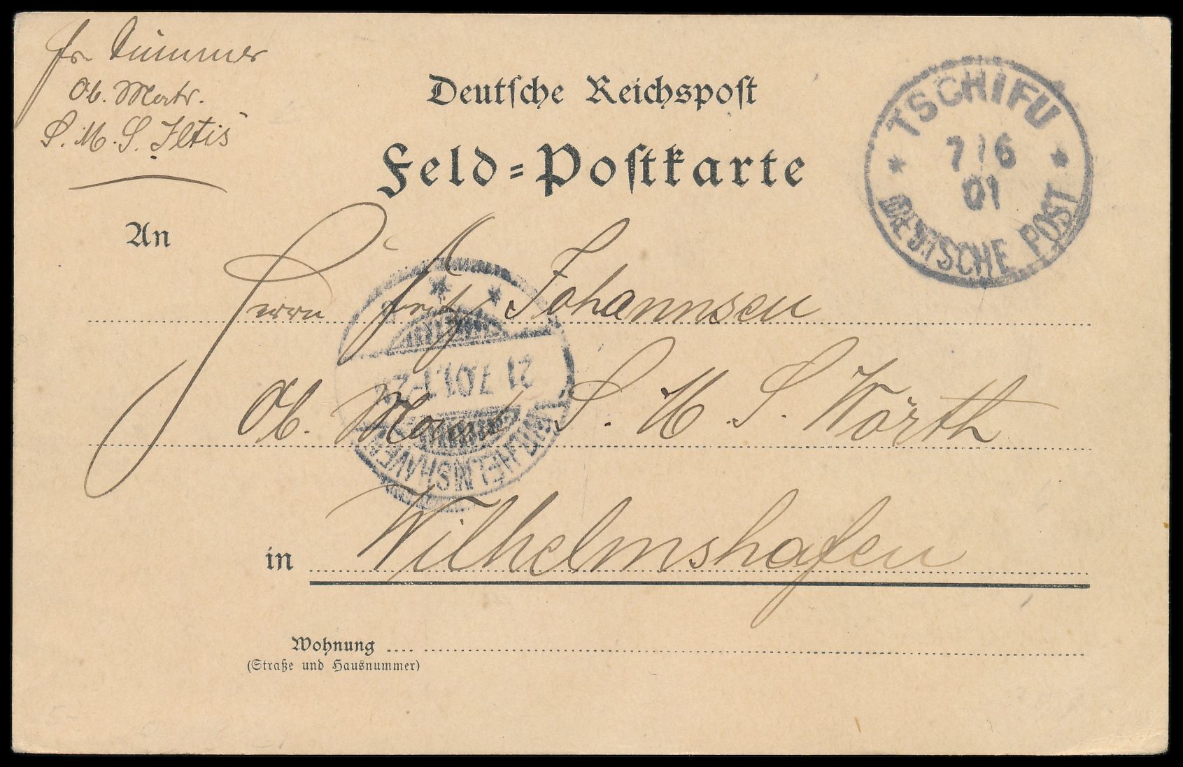 Stempel Tschifu 7.6.01 auf Feldpost-Vordruckkarte nach Wilhelmshaven, vorderseitig Absenderangabe ... S.M.S. Iltis, Ankunftstempel 21.7.01, Grußtext