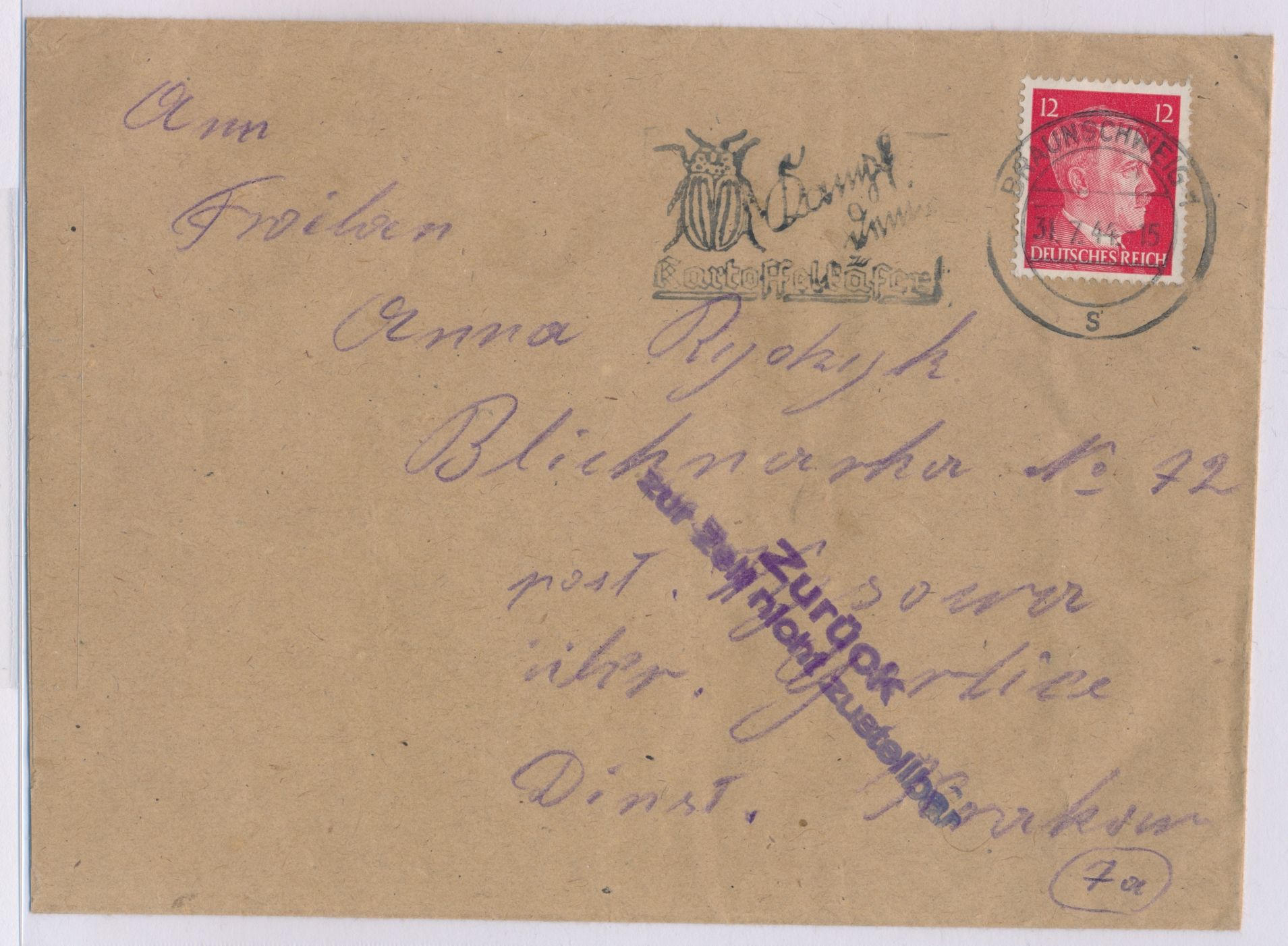 Brief mit 12 Pf. von Braunschweig 31.7.44 nach Wysowa über Gorlice (Distrikt Galizien), wegen des sowjetischen Vormarsches L2 Zurück 7 zur Zeit nicht zustellbar