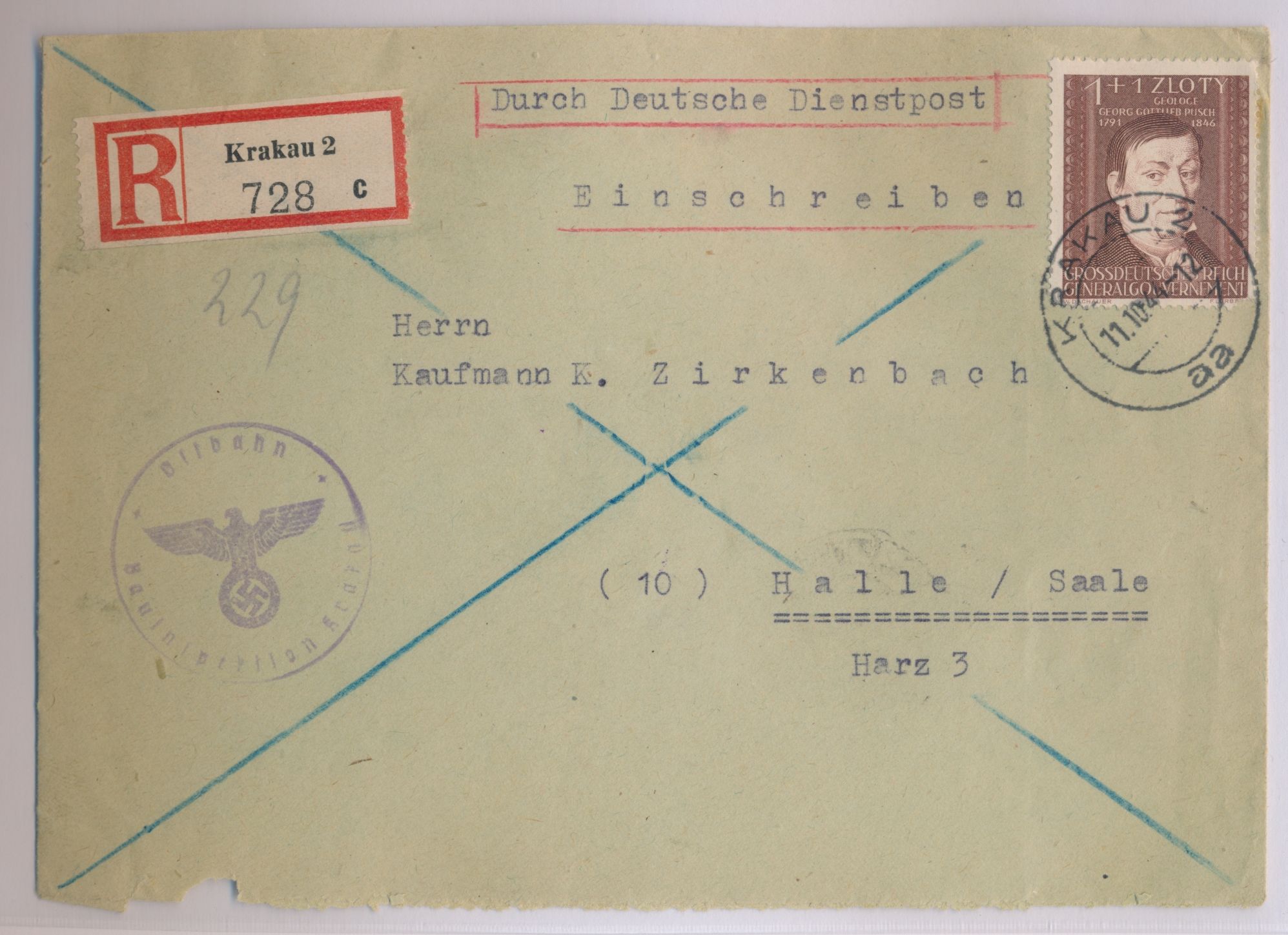Einzelfrankatur 1 Zl. "Gottlieb Pusch" auf überfrankiertem Einschreibbrief mit Stempel Krakau 2 11.10.44 nach Halle, Briefstempel Ostbahn / Baudirektion Krakau, Ankunftstempel 12.10.44