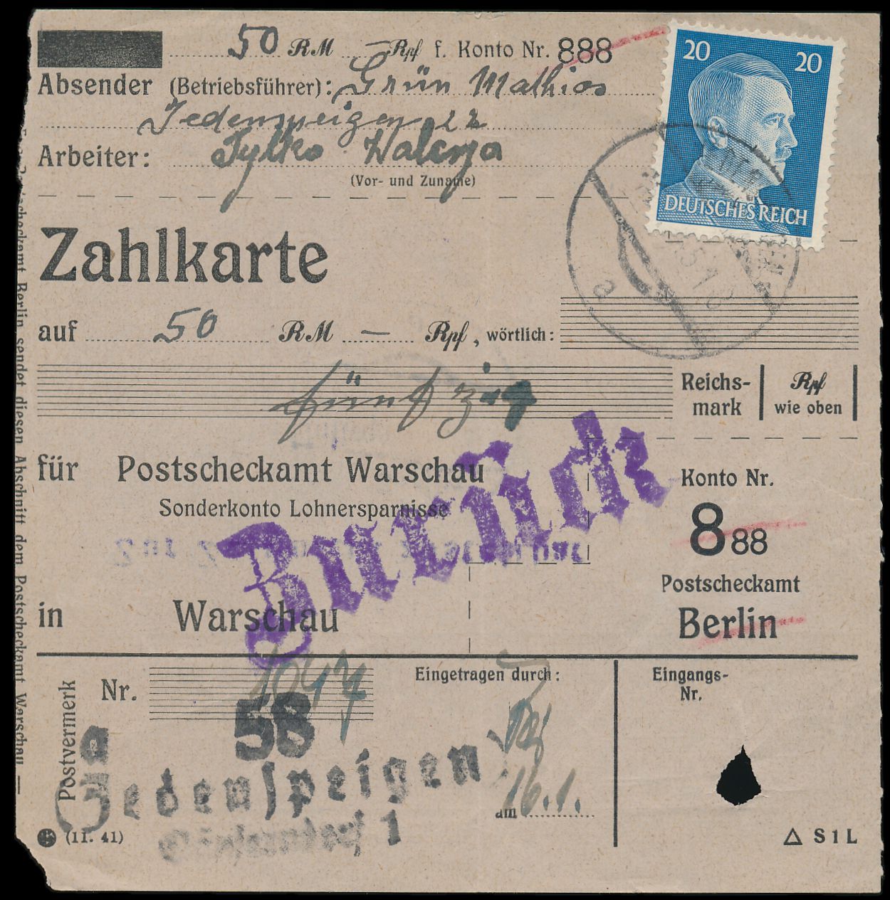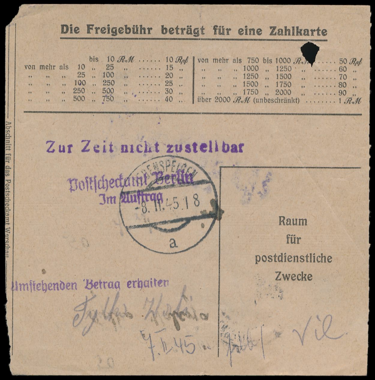 Einzelfrankatur 20 Pf. Hitler auf Zahlkarte für Postscheckamt Warschau / Sonderkonto Lohnersparnisse in Warschau, Österreich-Stempel Jedenspeigen 16.1.45, vorderseitig violetter L1 Zurück, rückseitig L1 "Zur Zeit nicht zustellbar" und L2 "Postscheckamt Berlin / Im Auftrag", Eingangsstempel Jedenspeigen 8.2.45 und Rückerstattungsvermerk