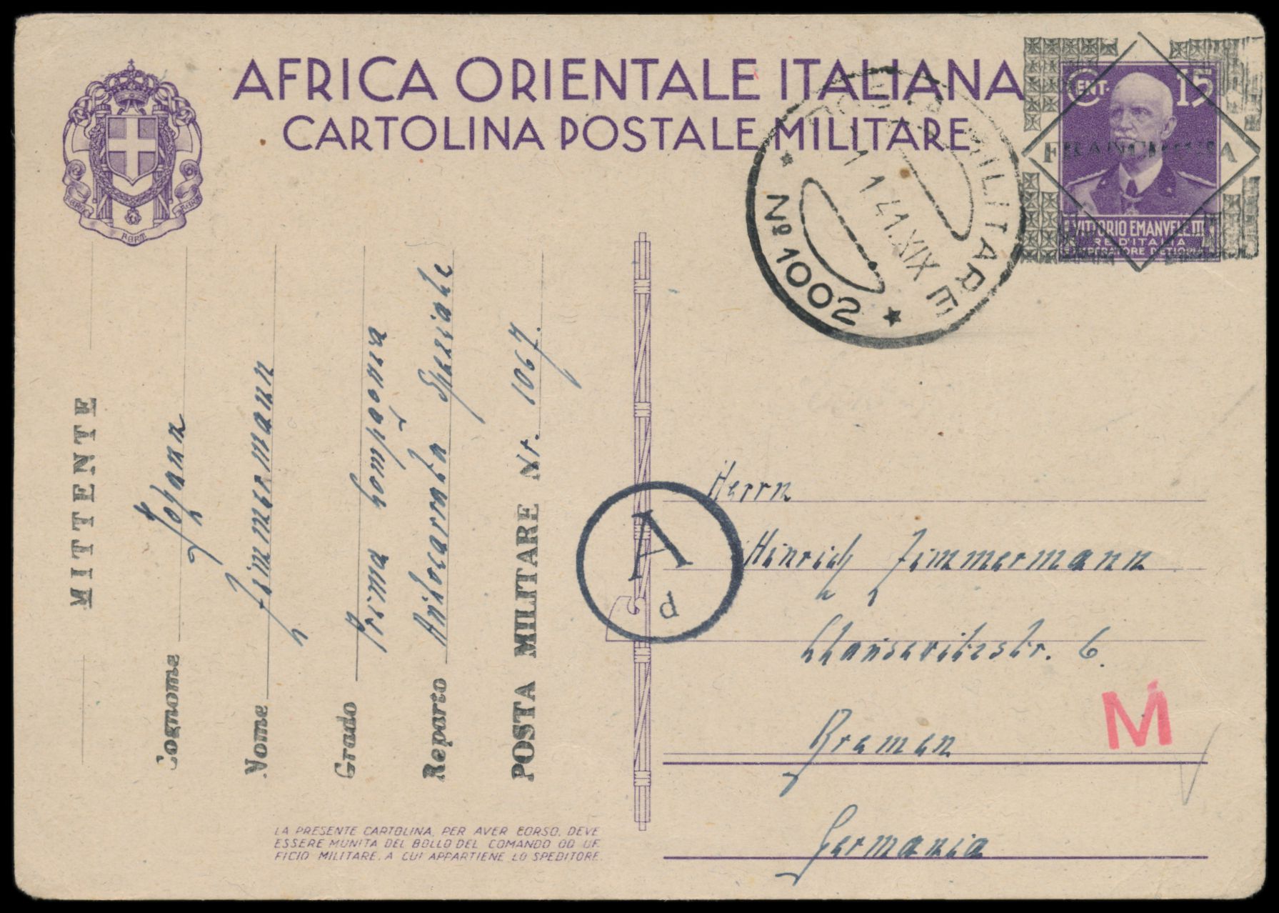 Ganzsache von Italienisch-Ostafrika mit Überdruck als Feldpostkarte, Absenderangabe "Johann Zimmermann, Prima Compania Autocarrata Speziale, Posta Militare Nr. 1067" und Stempel Posta Militare No. 1002 31.1.41, nach Deutschland, geschrieben von einem Angehörigen der Deutschen Freiwilligen Motorisierten Kompanie in Eritrea in den italienischen Streitkräften, im Juni 1940 zusammengestellt aus Besatzungsmitgliedern deutscher Handelsschiffe, Truppenstärke 138 Mann, Zensur-Durchlaufstempel Ad von München, Bedarf. Belege sind wegen der geringen Zahl und der kurzen Zeit des Bestehens (Juni 1940 bis März 1941) sehr selten