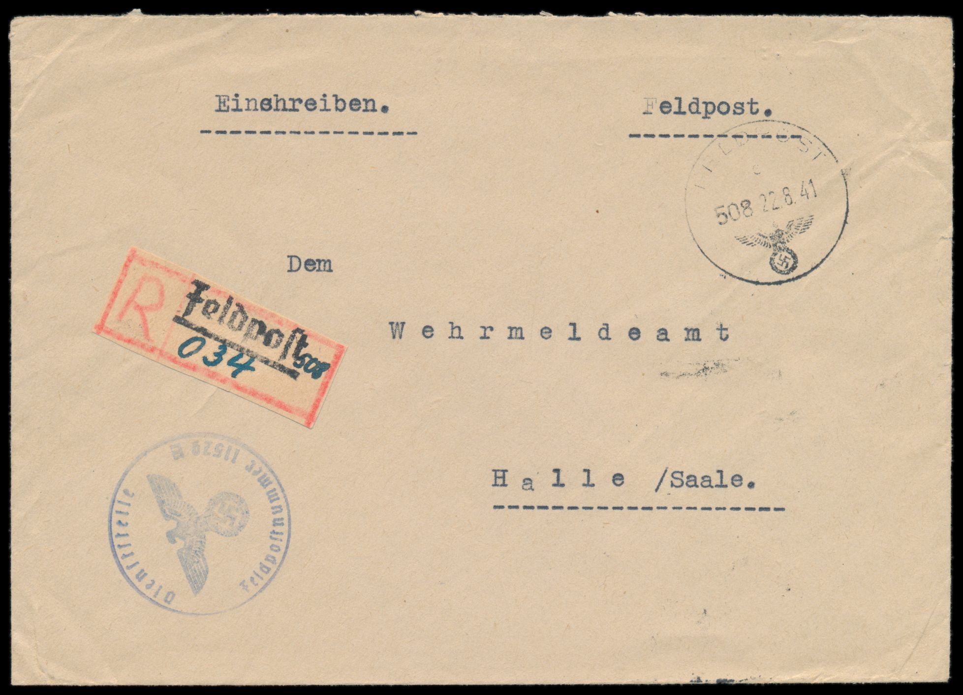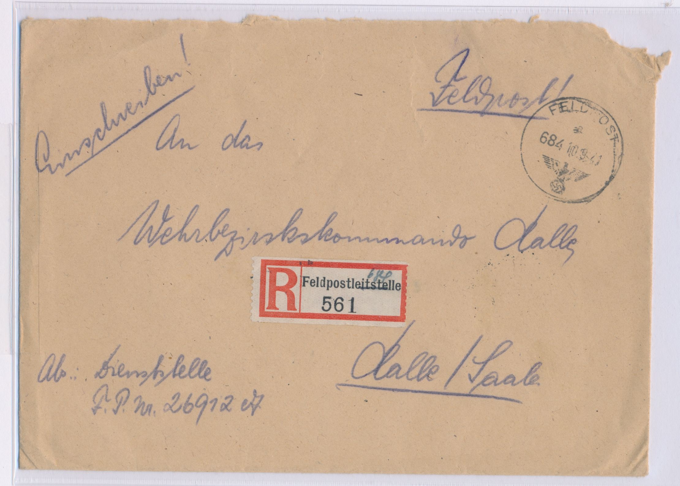 FPSt mit Kenn-Nr. 684 10.9.41, FPA 194, auf Einschreibbrief, R-Zettel Feldpostleitstelle handschriftlich abgeändert, Absender ... FPNr. 26912 A = Stab Infanterie-Regiment 274, Ankunftstempel Halle (Saale) 22.9.41, Umschlag hat rechts oben kleinen Eckfehler