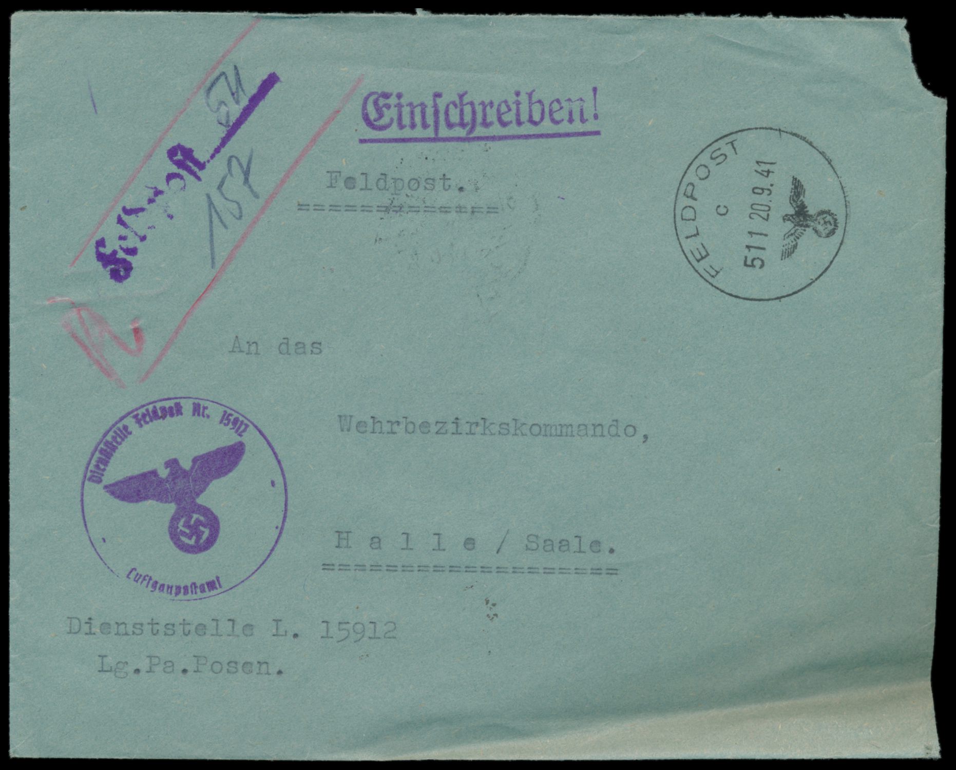 FPSt mit Kenn-Nr. 511 20.9.41 (Feldpostamt 775) auf R-Brief nach Halle, provisorischer R-Vermerk, Absender und Dienstsiegel Dienststelle FPNr. 15912, Umschlag hat rechts oben kleinen Eckfehler