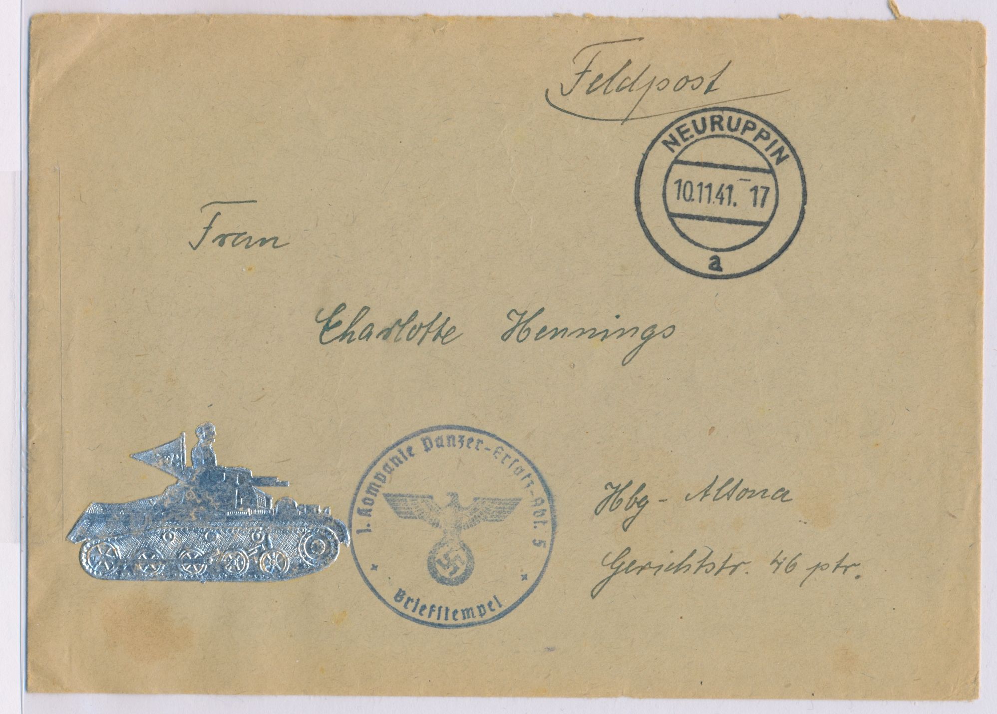 Feldpostbrief mit Stempel Neuruppin 10.11.41 nach Hamburg, Briefstempel 1. Kompanie Panzer-Ersatz-Abt. 5 und silberfarbene Vignette "Panzerkampfwagen"