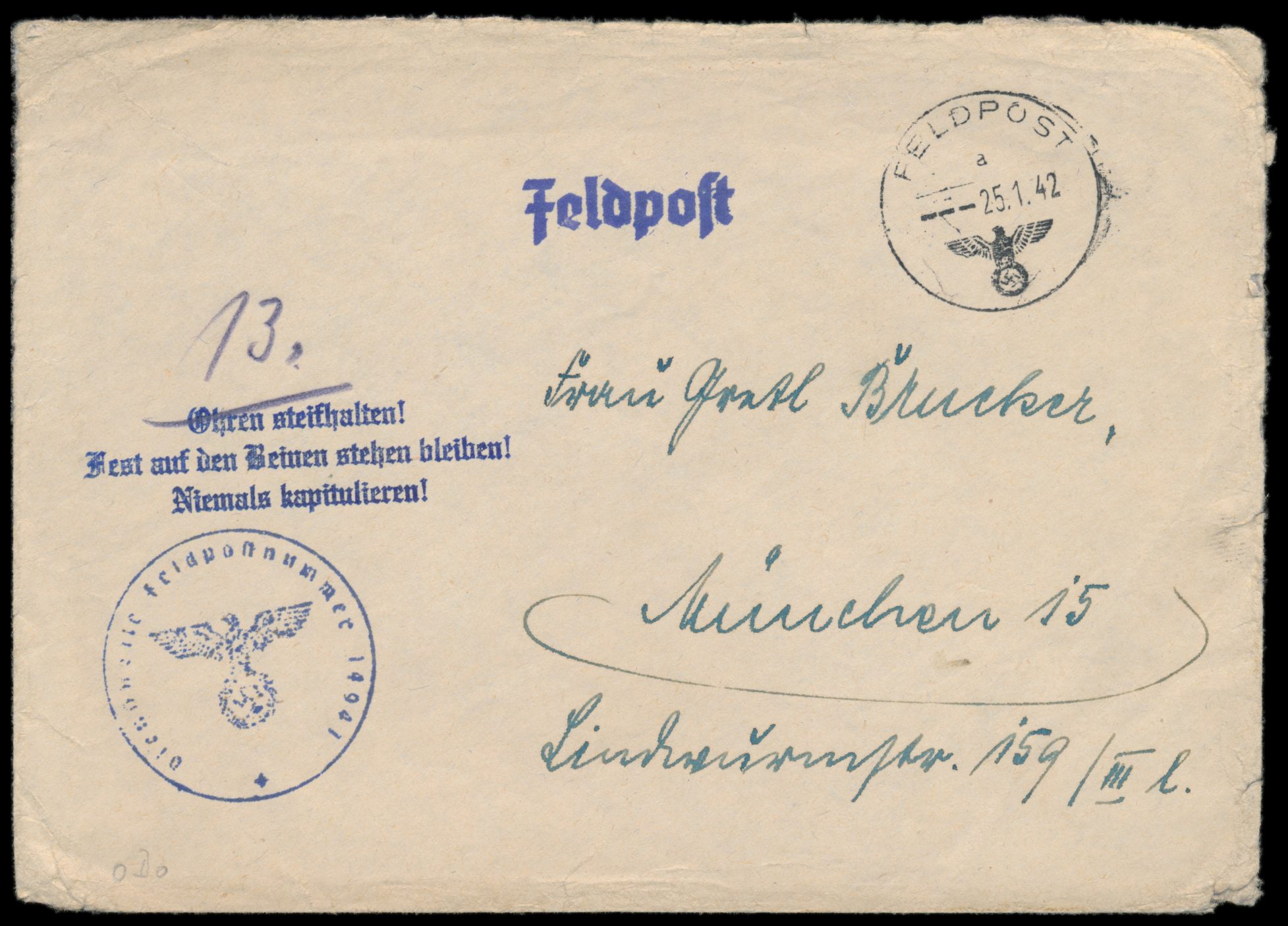 Brief mit FPSt a 25.1.42 nach München, Absender und Briefstempel ... FPNr. 14941 = Verpflegungsamt 713, seltener Propagandastempel "Ohren steifhalten! / Fest auf den Beinen stehen bleiben! / Niemals kapitulieren!" , leichte Alterungsspuren, Bedarf