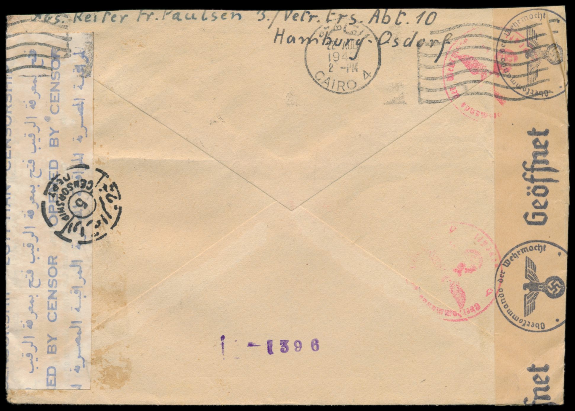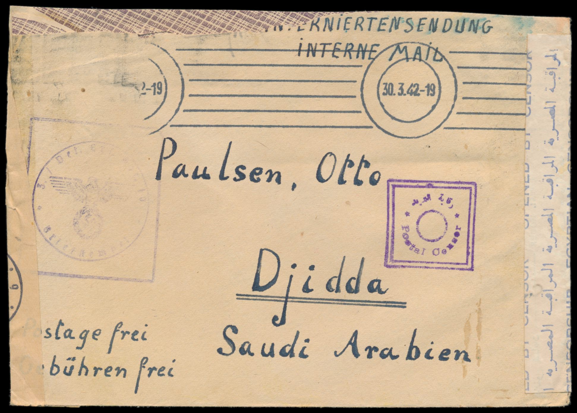 Feldpostbrief mit stummem Maschinenstempel (von Hamburg) 30.3.42 portofreie Interniertensendung and einen Deutschen im Internierungslager Djidda / Saudi Arabien, Briefstempel und Absender "... 3. Vetr. Ers. Abt. 10, Hamburg-Olsdorf", deutsche Zensur Berlin und ägyptische Zensur, Durchgangsstempel Cairo 22.7.42. Der Empfänger gehört wahrscheinlich zur Besatzung des nach der Flucht aus Massaua bei der Insel Perim selbstversenkten NDL-Dampfers Oder. Der Umschlag hat vorderseitig oben links eine kleine Fehlstelle, auf Feldpost äußerst seltene Übersee-Destination