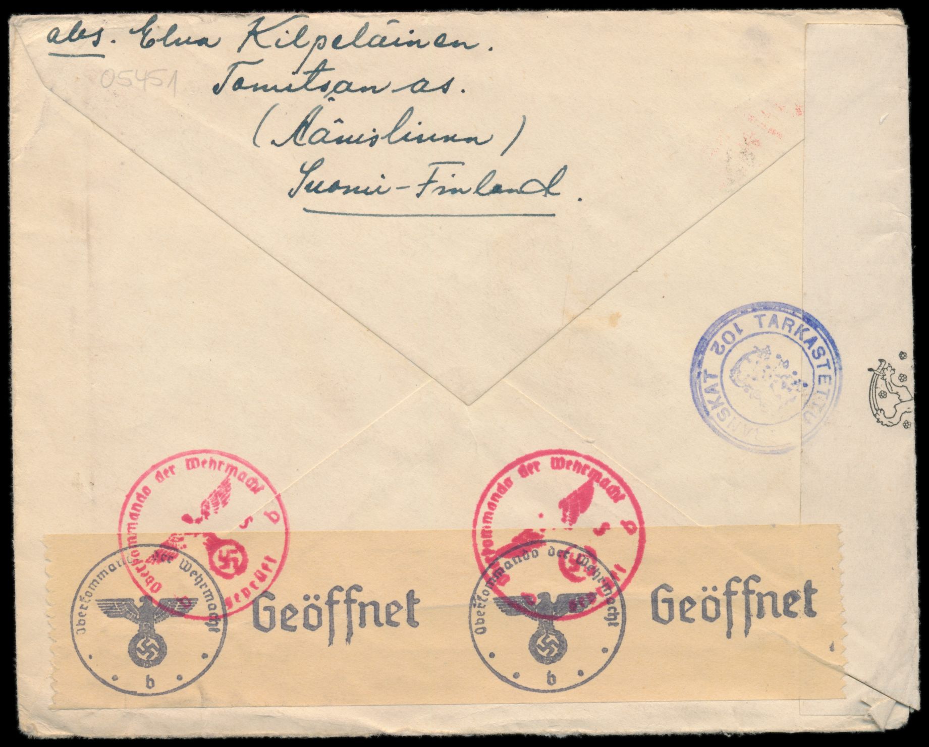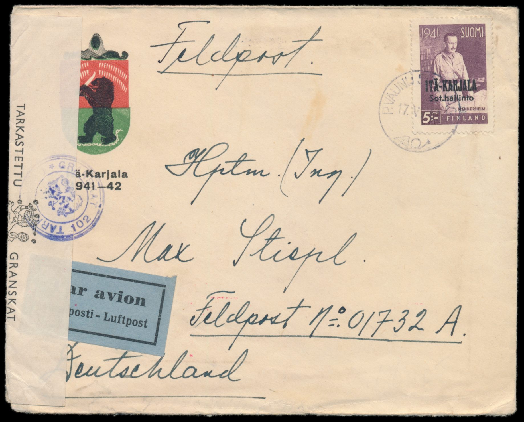 Finnische Besetzung von Ostkarelien: Einzelfrankatur 5 M. mit finnischem Bahnpoststempel P. Vannu 50 17.5.42 (Bahnstrecke Äänislinna - Matkaselkä) auf Luftpostbrief mit Absender aus Äänislinna an einen deutschen Hauptmann mit FPNr. 01732 A = Stab II Artillerie-Regiment 109, links finnische Zensur und rückseitig deutsche Zensur Berlin, Bedarf