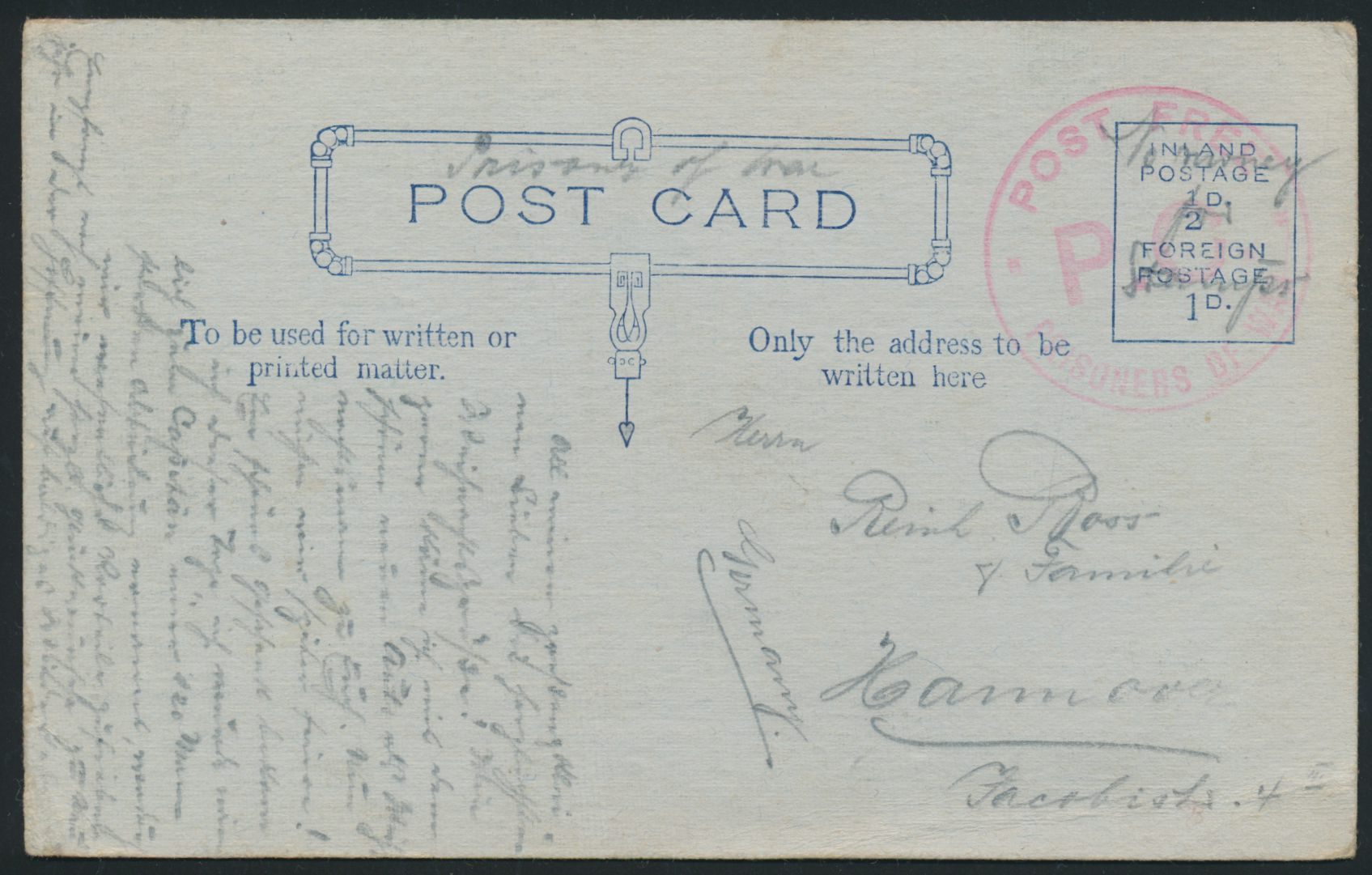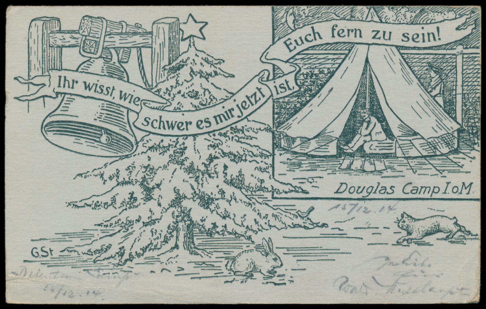 Douglas Camp I. o. M., seltene Weihnachtskarte aus der Lagerdruckerei nach Hannover, geschrieben am 15.12.1914, roter P.C.-Stempel
