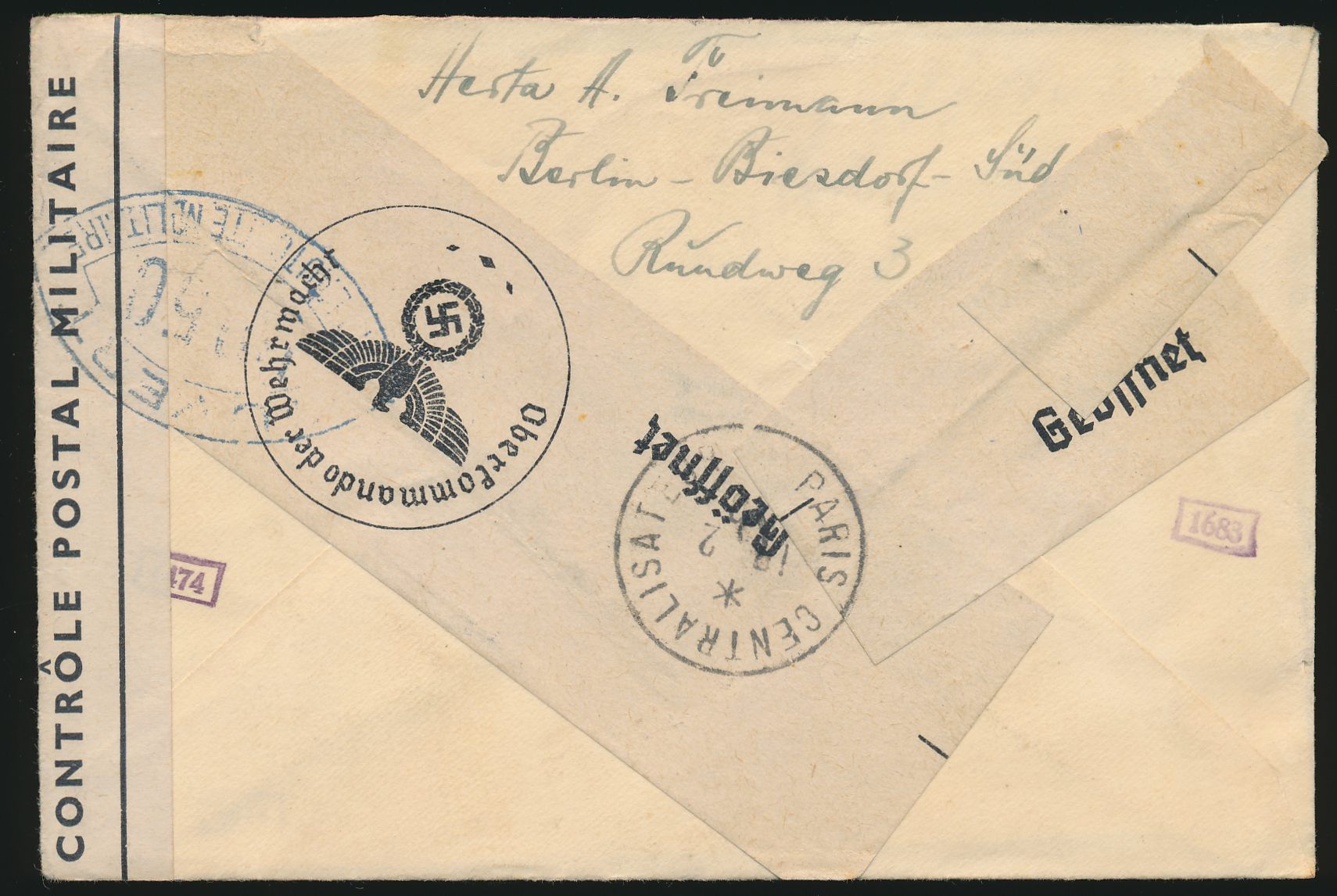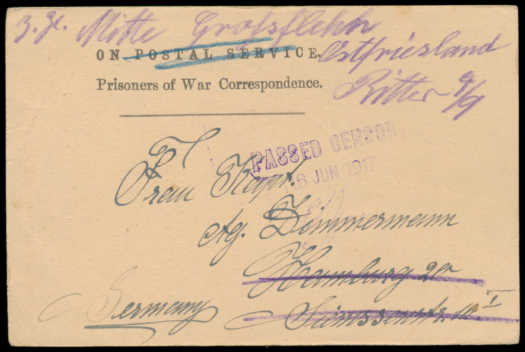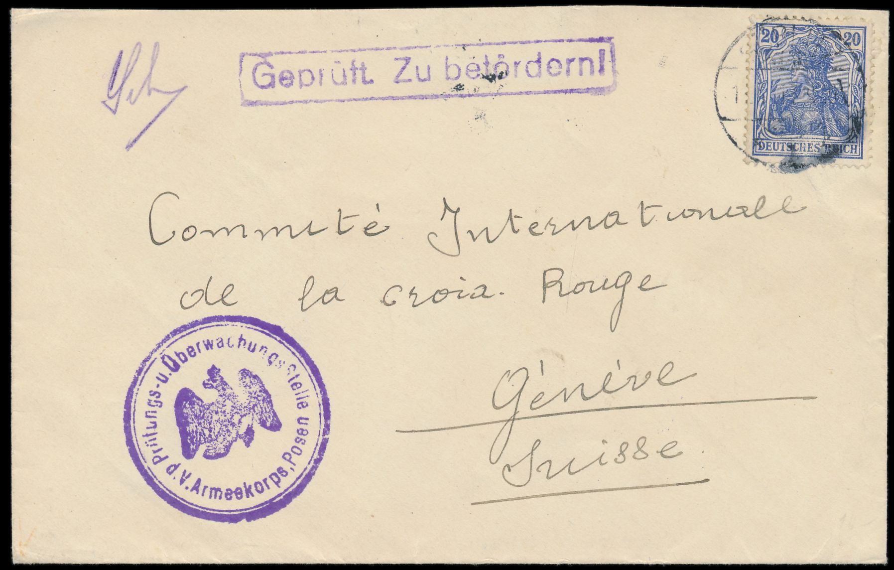 Brief eines Angehörigen des in Görlitz internierten IV. Griechischen Armeekorps an das Rote Kreuz in Genf, Frankatur 20 Pf., Stempel Görlitz 11.4.17, vorderseitig blauer R1 "Geprüft. Zu befördern!" und Dienstsiegel "Prüfungs- u. Überwachungsstelle d. V. Armeekorps, Posen", rückseitig L1 "Militärischerseits unter Kriegsrecht geöffnet", Ankunftstempel Geneve 14.4.1917. Das IV. Griechische Armeekorps geriet im Verlauf des Balkan-Feldzuges zwischen die Fronten der Alliierten und der Deutsch-bulgarischen Armee und wurde schließlich in Kavala eingekesselt und darauf in Deutschland interniert.