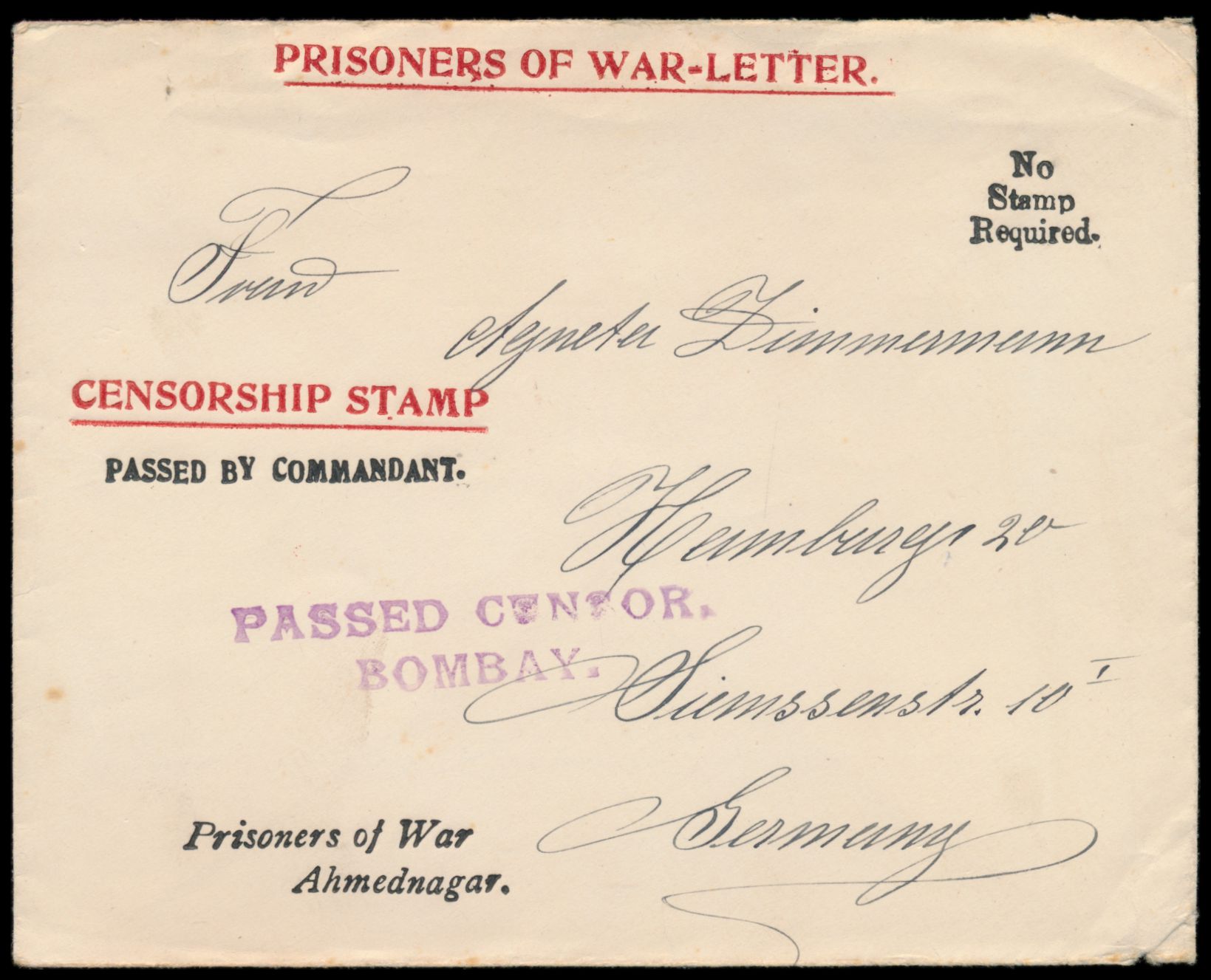1914 bis 1918, Korrespondenz von 19 Karten und 2 Briefen aus Deutschland an den internierten Kapitän des Dampfers Braunfels Johann Zimmermann im indischen Internierungslager Ahmednagar, alle mit Zensur, insgesamt 21 Belege in guter Erhaltung
