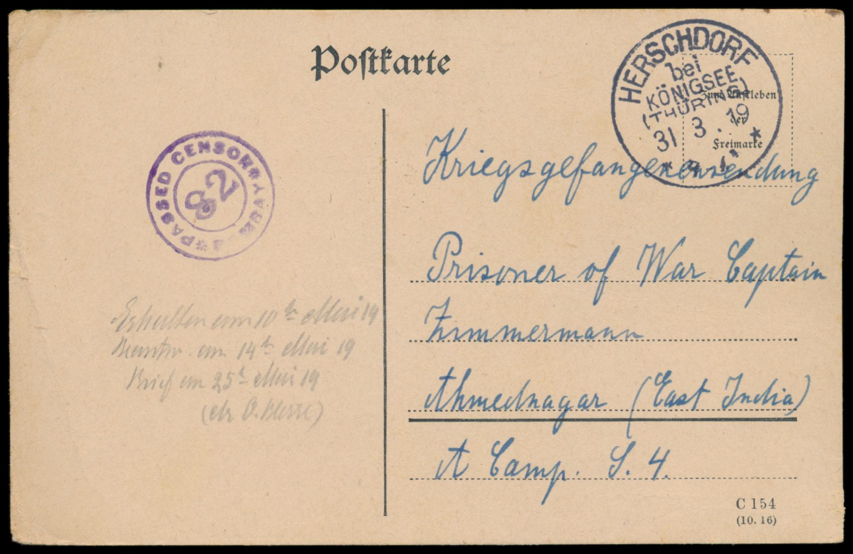 Karte aus dem indischen Internment Camp Yercaud an den internierten Kapitän des Dampfers Braunfels im indischen Internierungslager Ahmednagar, Johann Zimmermann, Stempel Yercaud 10.3.18 und Zensurstempel Passed By Censor Yercaud