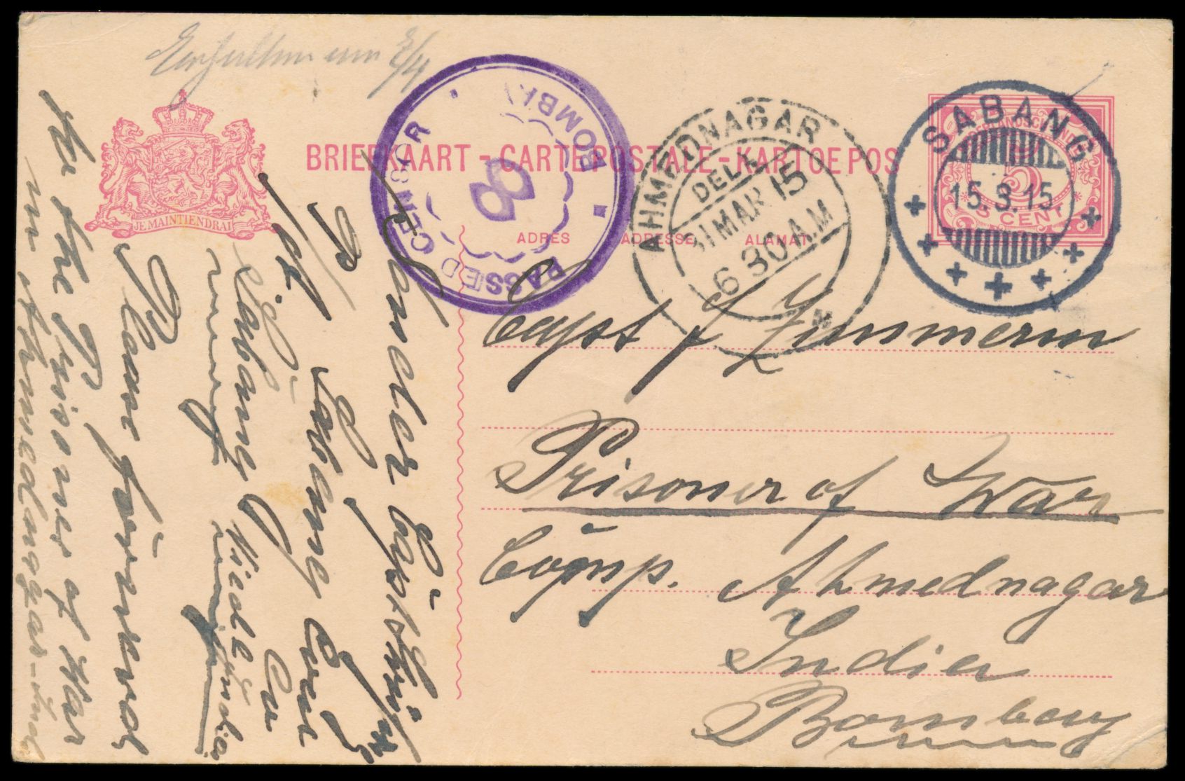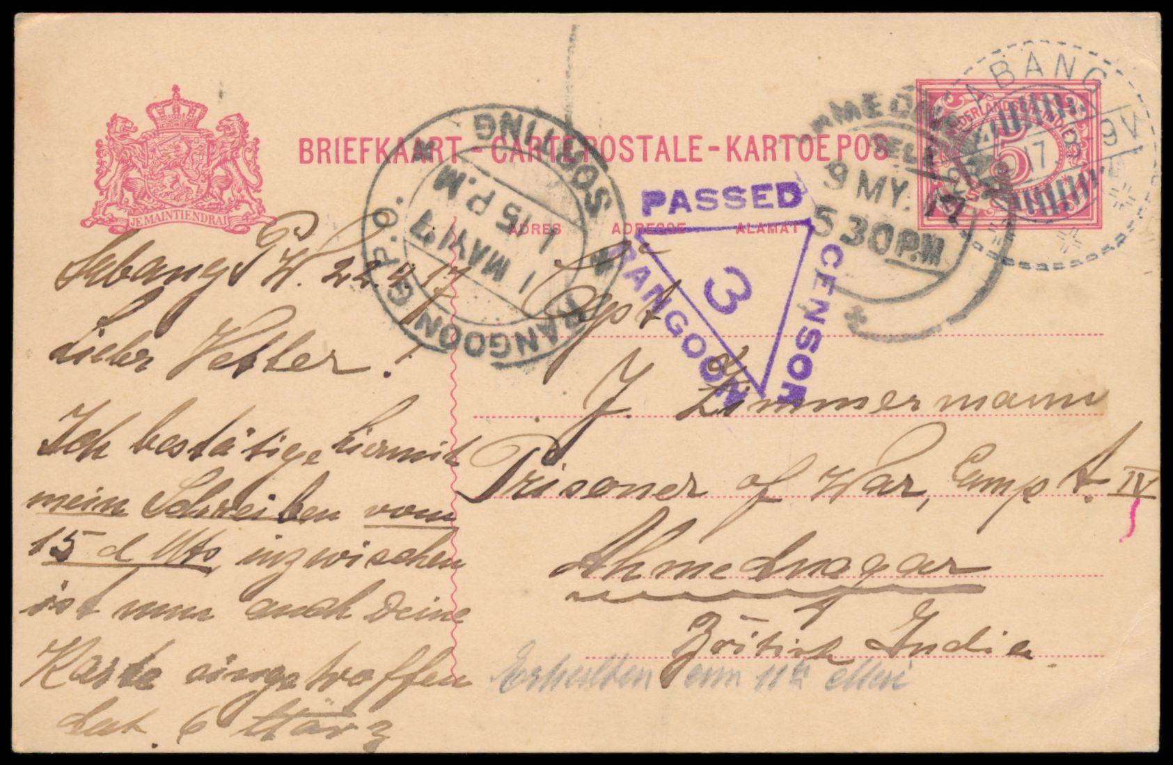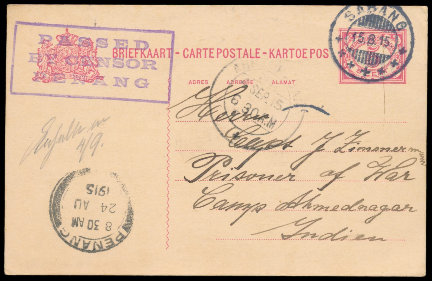 1915 bis 1917, Korrespondenz von 7 Niederländisch-Indien-Ganzsachen aus Sabang an den internierten Kapitän des Dampfers Braunfels Johann Zimmermann im indischen Internierungslager Ahmednagar, meist mit Zensur (Bombay, Penang, Rangoon) und Ankunftstempel, gute Erhaltung