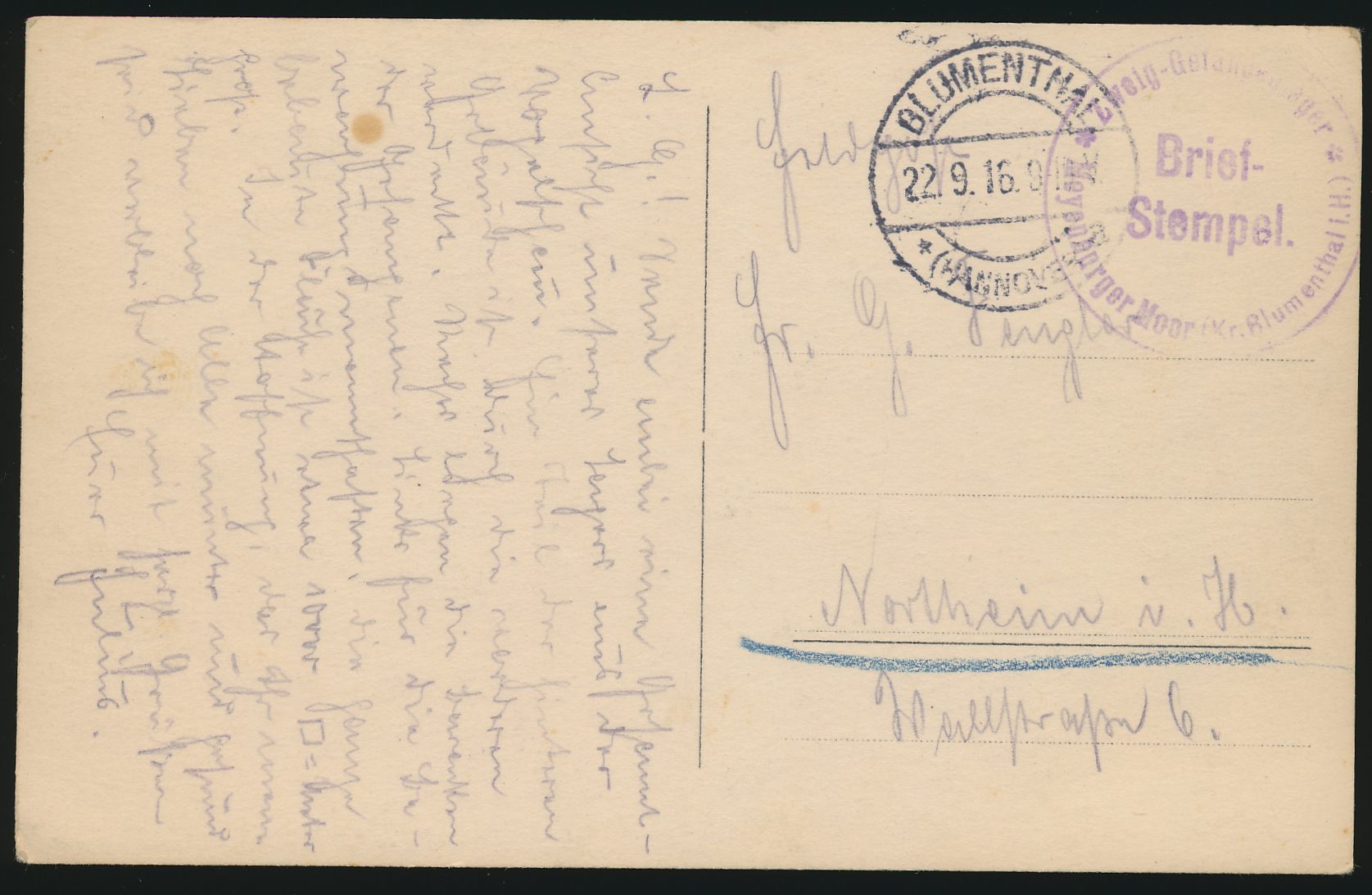 Stempel Blumenthal (Hannover) 22.9.16 und Briefstempel Zweig-Gefangenenlager Meyenburger Moor (Kr. Blumenthal i. H.) auf Foto-Ansichtskarte des Lagers, Feldpost nach Northeim