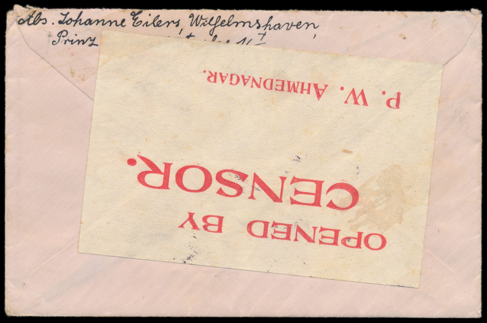 Brief mit Stempel Grossefehn 1.4.18 an den internierten Kapitän des Dampfers Braunfels im indischen Internierungslager Ahmednagar, Johann Zimmermann, Zensurstempel Cöln-Deutz, rückseitig seltener Verschlußzettel "Opened By Censor P. W. Ahmednagar" , handschriftlicher Eingangsvermerk 22.6.1918