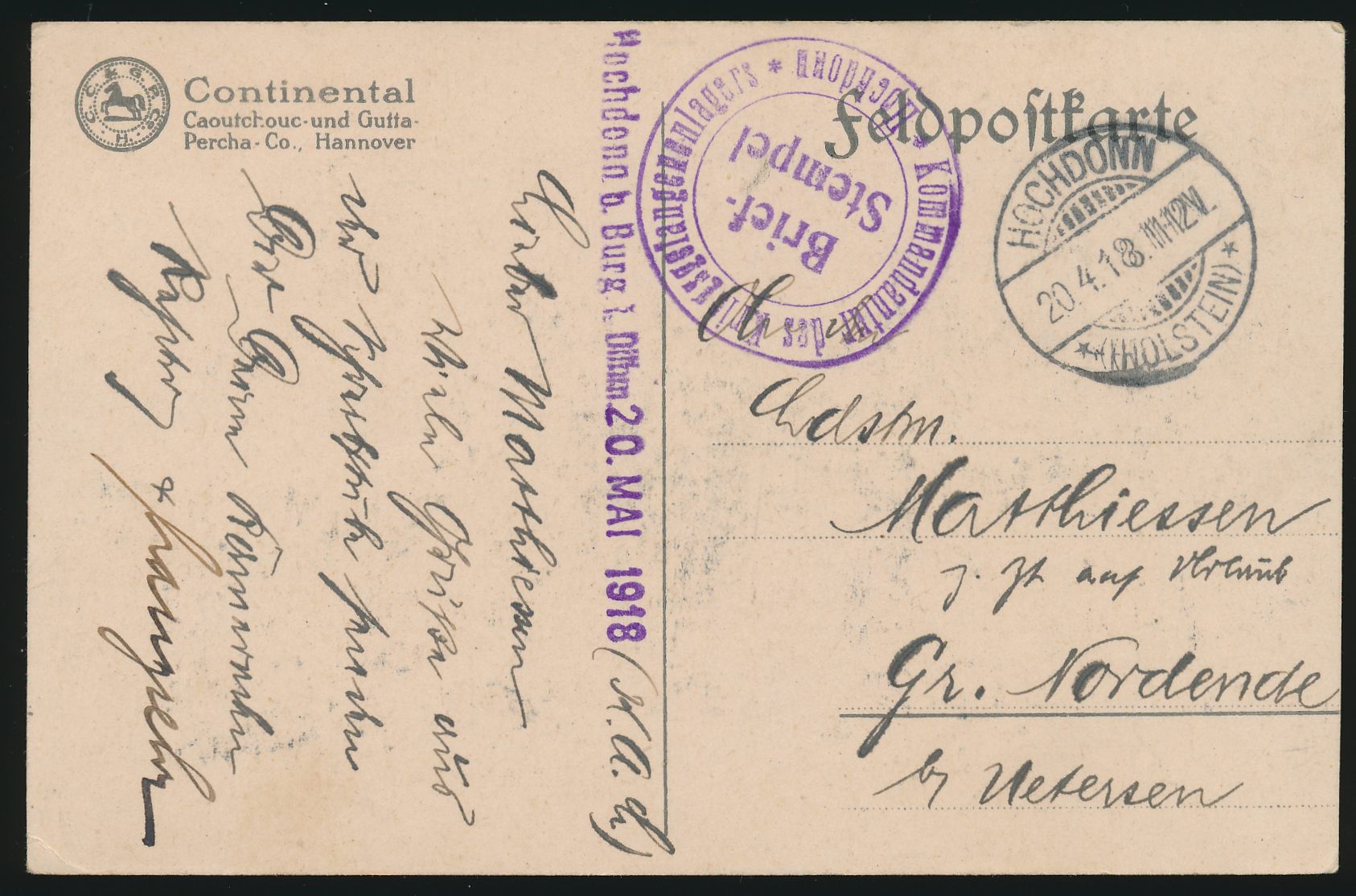 Stempel Hochdonn (Holstein) 20.4.18 und Briefstempel Kommandantur des Kriegsgefangenenlagers Hochdonn auf Reklamekarte Continental nach Uetersen