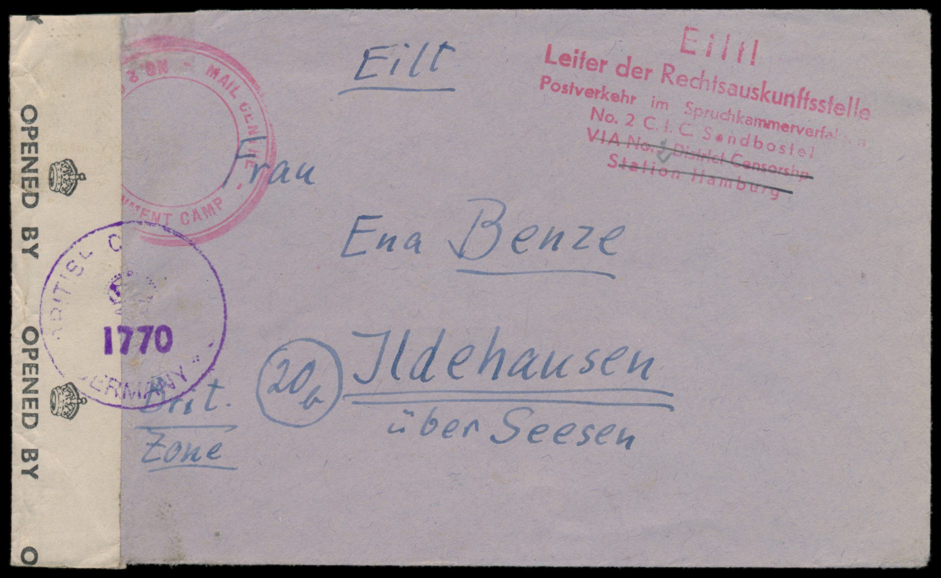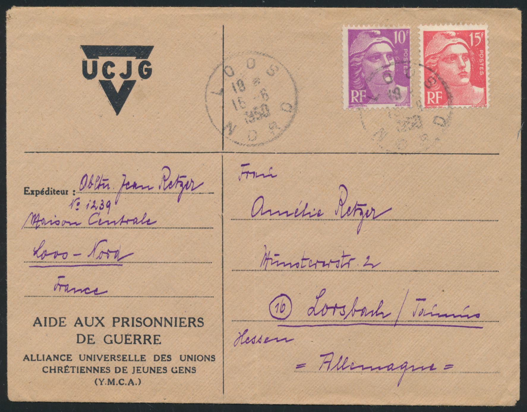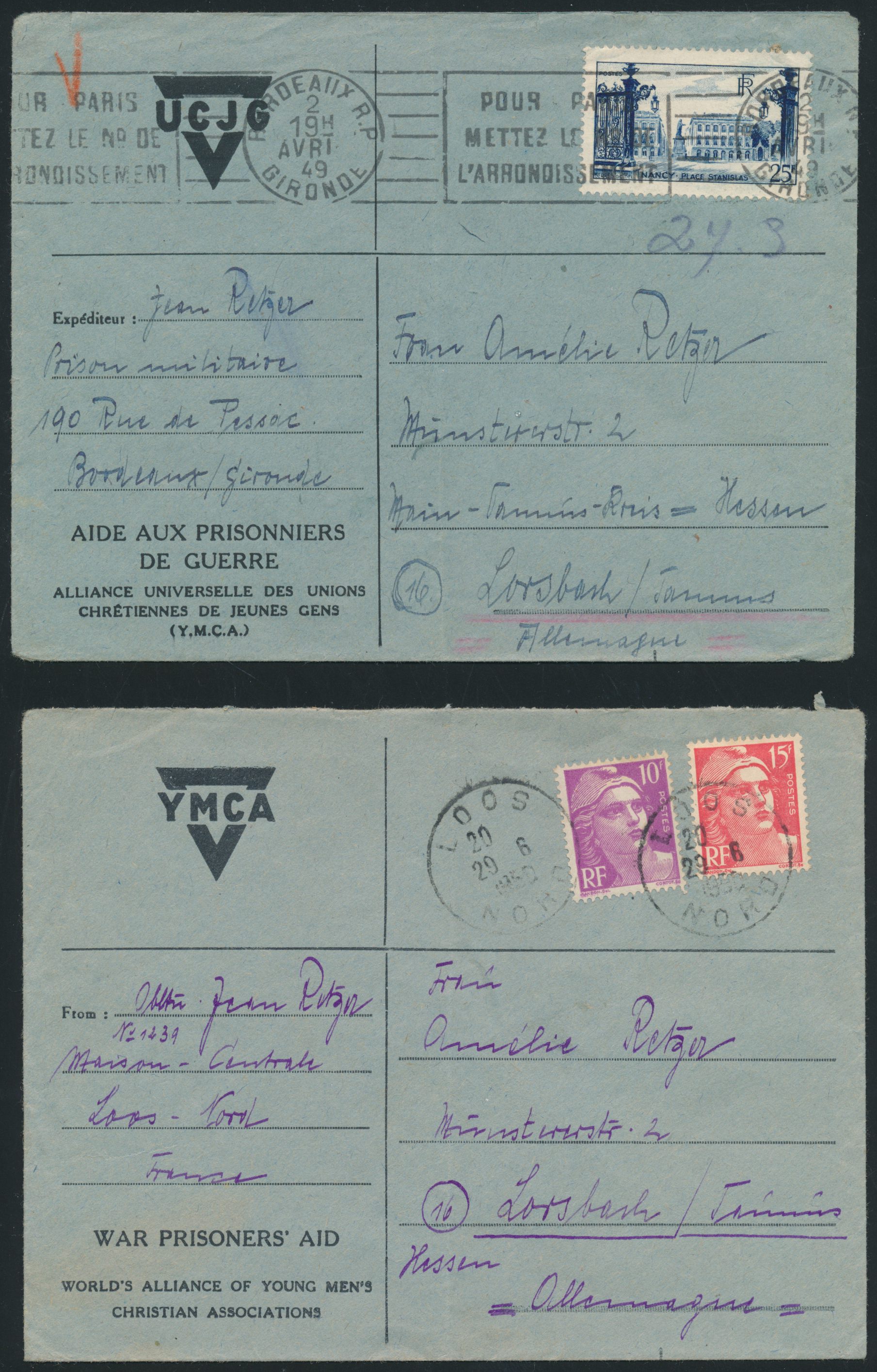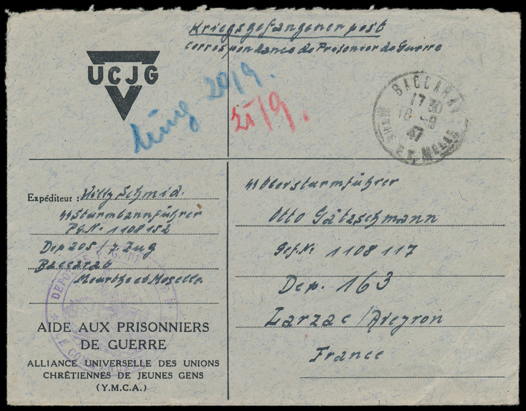 Vordruckumschlag UCJG (Y.M.C.A.) mit Absenderangabe "Willy Schmid SS-Sturmbannführer ... Dep. 205 ... Baccarat, Meuthe et Moselle" an einen SS-Untersturmführer im Dep. 163 Larzac, Aveyron, Lager-Zensurstempel und Poststempel Baccarat 18.9.47, zweisprachiger Inhalt mit Bitte an den Lagerkommandanten eine Urkunde an den Empfänger zu übergeben. Kriegsgefangenenbriefe von SS-Angehörigen mit Rangbezeichnung sind selten
