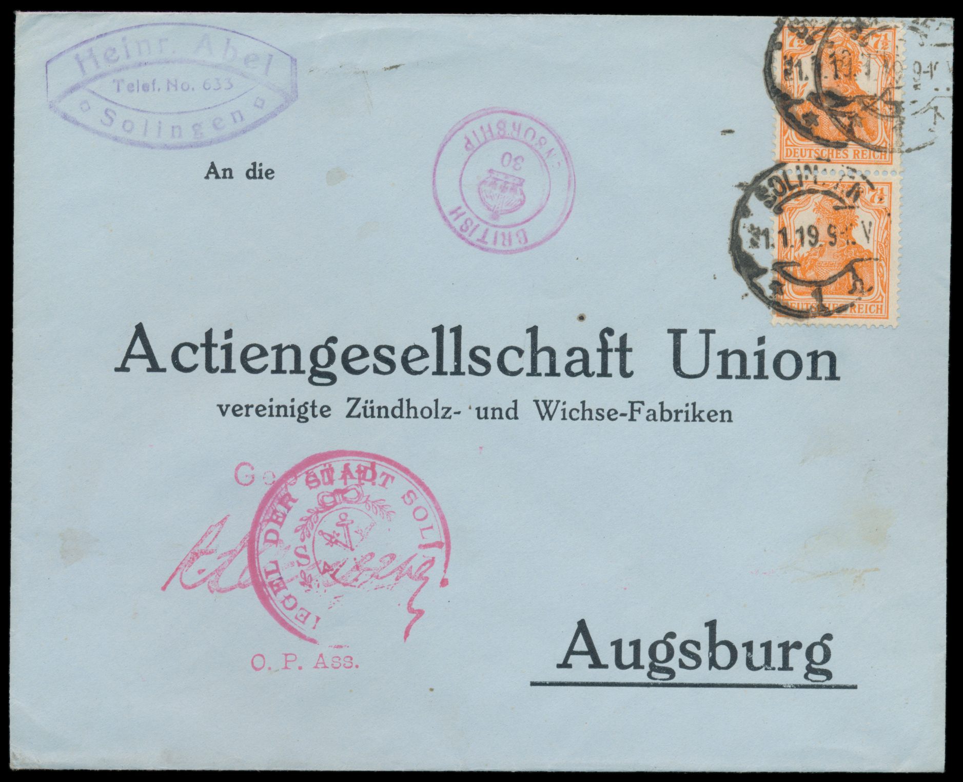 Rheinland-Besetzung, Firmenbrief mit 2 x 7 1/2 Pf. mit Stempel Solingen 1 21.1.19 nach Augsburg, rotes Dienstsiegel "Siegel der Stadt Solingen" und L3 mit faksimilierter Unterschrift "Geprüft ... O.P.Ass.", kleiner Zweikreisstempel British Censorship mit Krone und Zensor-Nr. 30, im Handbuch von Steven / Meyer nur bis Nr. 29 belegt