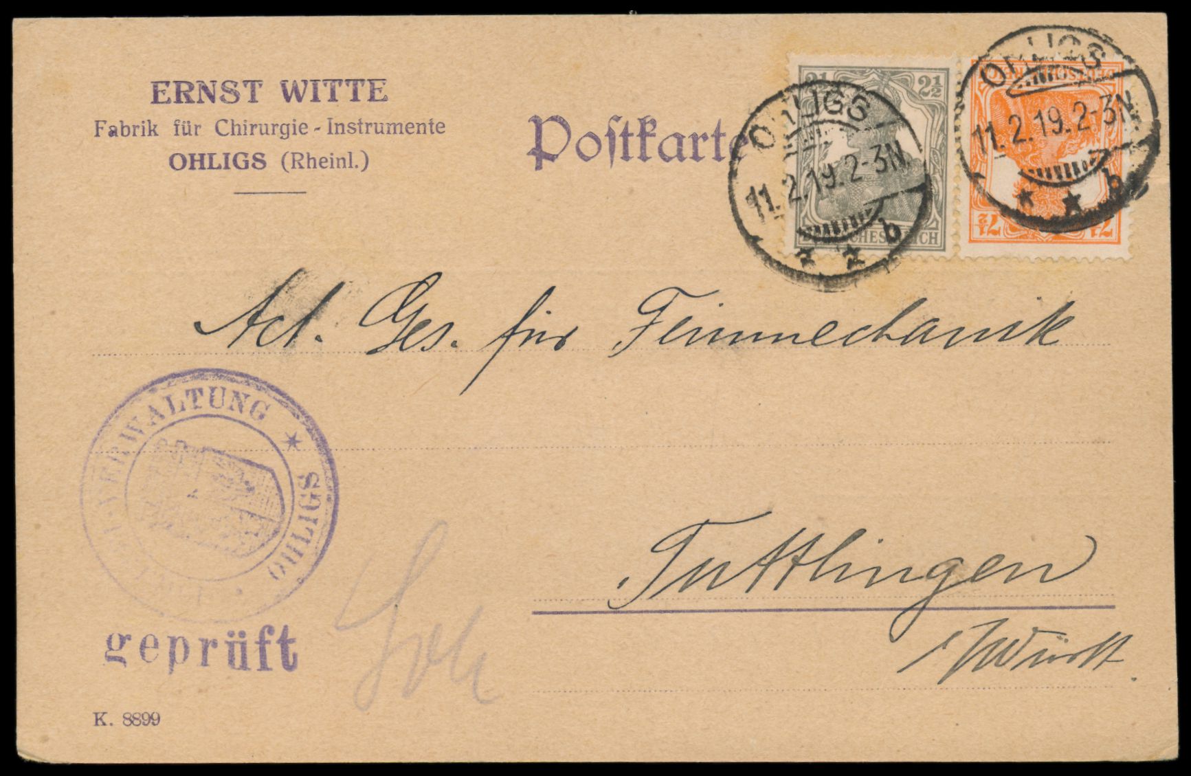 Rheinland-Besetzung, Firmenkarte mit Stempel Ohligs 11.2.19 nach Tuttlingen, violettes Dienstsiegel Polizei-Verwaltung Ohligs und L1 geprüft, Bedarf