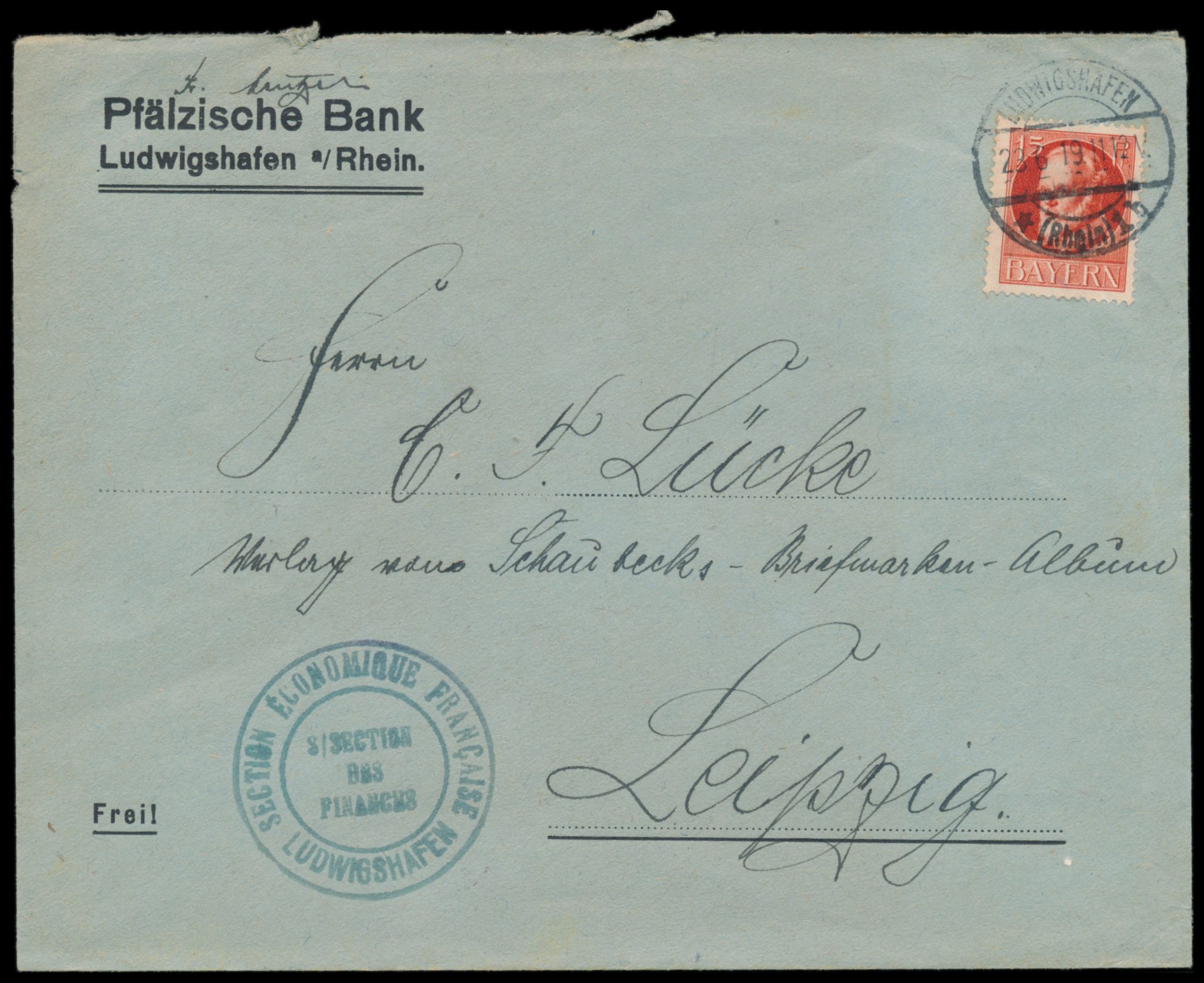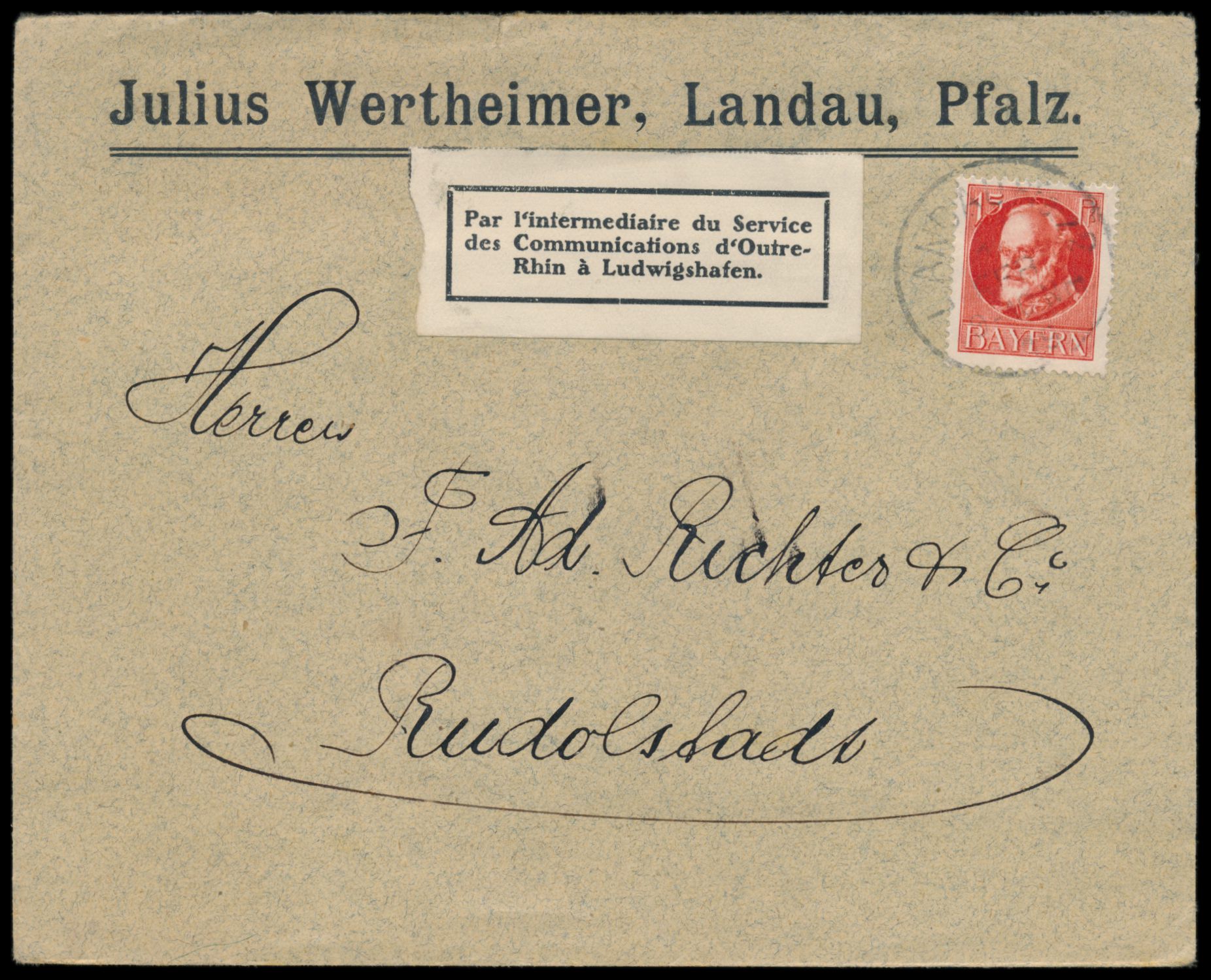 Rheinland-Besetzung, Bayern 15 Pf. auf Firmenbrief mit Stempel Landau, Pfalz 2 14.2.19 nach Rudolstadt, weißer Leitzettel über das Überrheinische Verkehrsamt in Ludwigshafen in französischer Sprache
