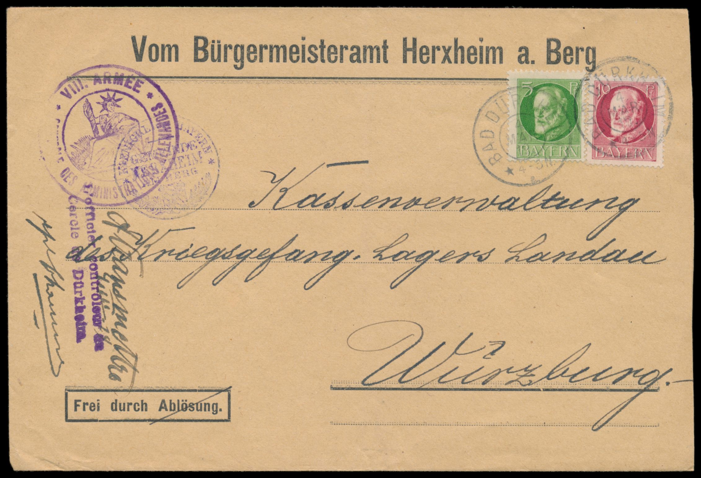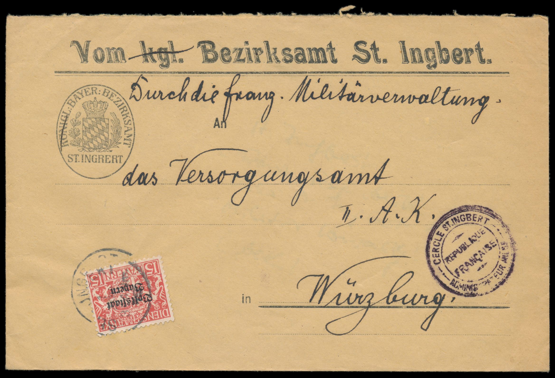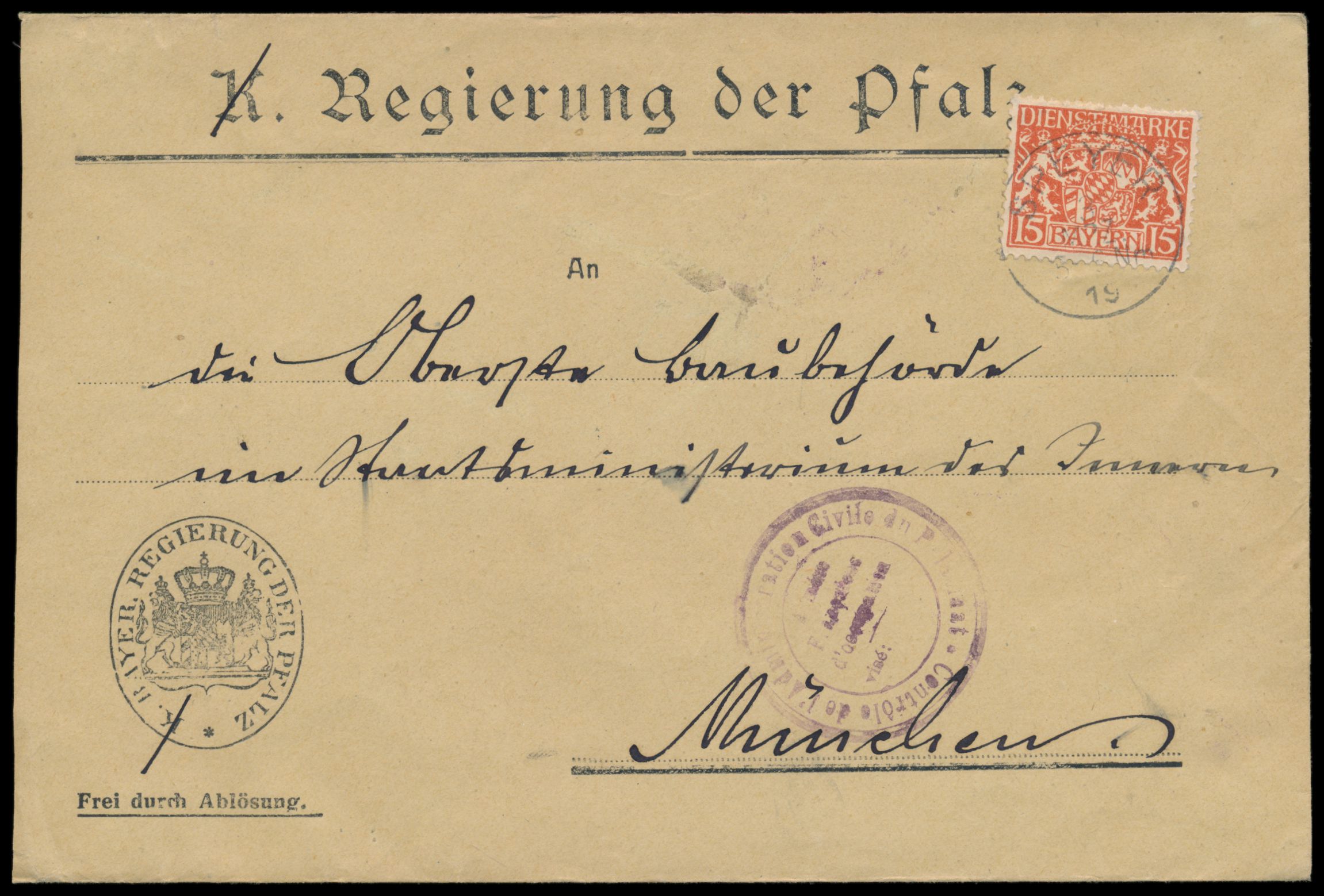 Rheinland-Besetzung, Behördenbrief mit Bayern-Dienstmarke 15 Pf. mit Stempel Speyer 3.3.19 nach München, violetter Kreisstempel Controle de l`Administration Civile du Palatinat / Armee Francaise d`occupation visé: ... der Überwachungsstelle Speyer
