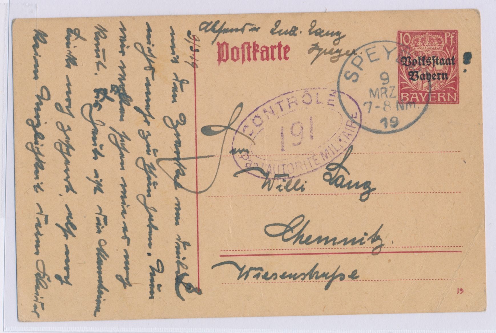 Rheinland-Besetzung, Bayern-Ganzsache 10 Pf. mit Stempel Speyer 9.3.19 nach Chemnitz, violetter Ovalstempel Contrôle Par L´Autorité Militaire 191 der französischen Zensurstelle Ludwigshafen (laut Handbuch Steven / Meyer), Bedarf