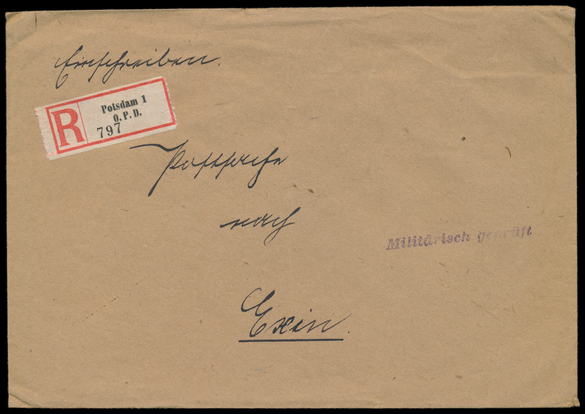 Einschreibbrief "Postsache" nach Exin im polnischen Aufstandsgebiet (Provinz Posen), ohne Aufgabestempel, R-Zettel "Potsdam 1 O. P. D.", violetter L1 Militärisch geprüft der Zensurstelle Schneidemühl, Ankunftstempel Exin 23.3.19, schwacher senkrechter Mittelbug