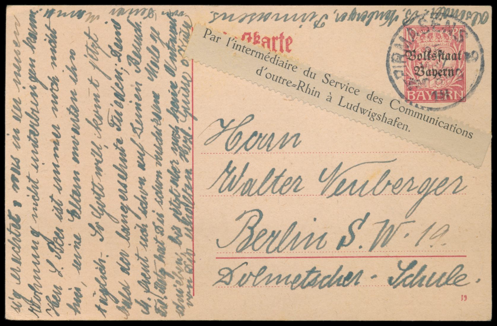 Rheinland-Besetzung, Ganzsache 10 Pf. "Volksstaat Bayern" mit Stempel Pirmasens 2 25.3.19 nach Berlin, gezähnter Leitzettel über das Überrheinische Verkehrsamt in Ludwigshafen in französischer Sprache