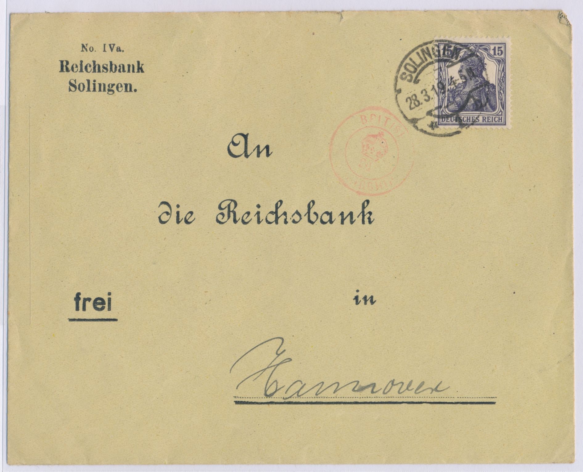 Rheinland-Besetzung, 15 Pf. auf Brief der Reichsbank Solingen nach Hannover, Stempel Solingen 1 28.3.19, roter Zensur-Kreisstempel British Censorship mit Krone und Zensor-Nr. 24