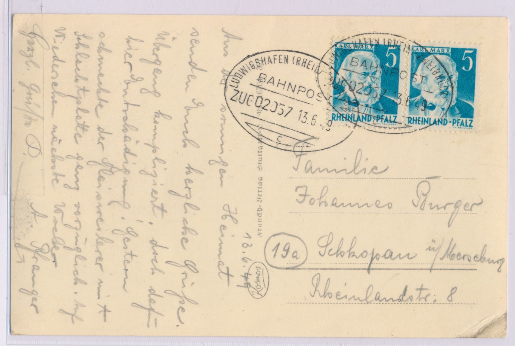 2 x Bahnpoststempel Ludwigshafen (Rhein) - Zweibrücken Zug 02057 13.6.49 auf Ansichtskarte von Annweiler mit 2 x 5 Pf. nach Schkopau, Bedarf