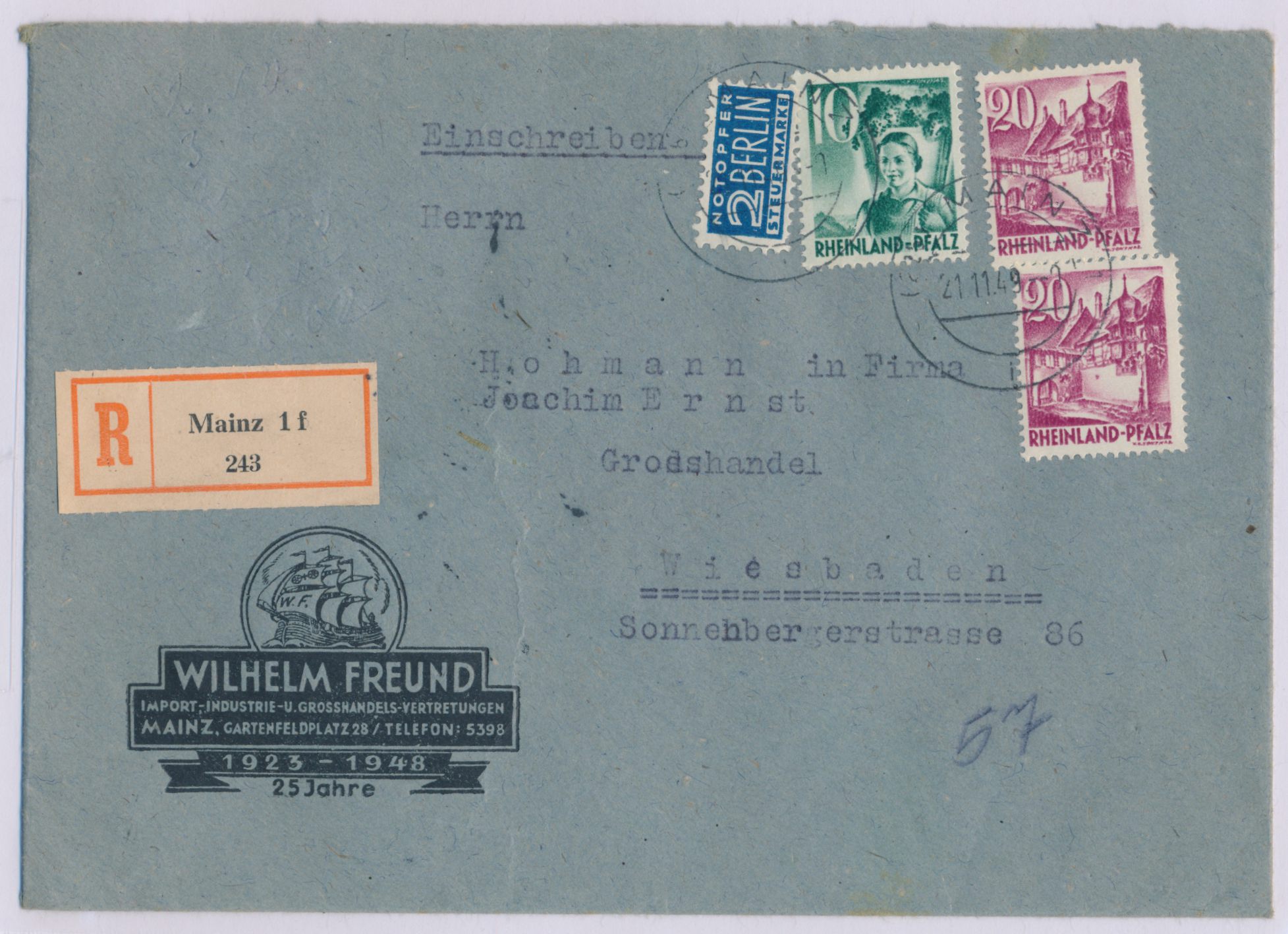 Rheinland-Pfalz 10 und 2x 20 Pfg. und Notopfermarke auf Einschreibbrief im Ortstarif mit Stempel Mainz 1 21.11.49 nach Wiesbaden, Ankunftstempel 21.11.49, portorichtig, Bedarf