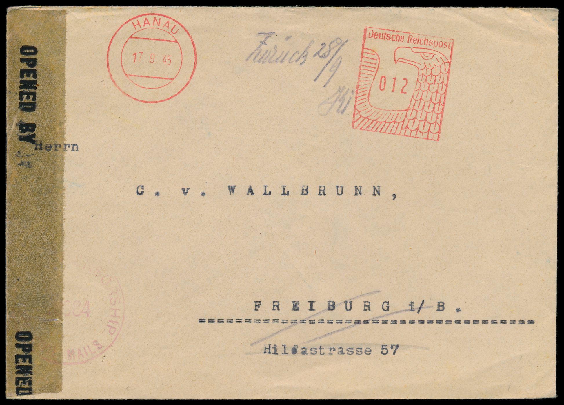 Postalia-Absenderfreistempel Hanau 17.9.45 mit Adlerkopf-Wertrahmen 012 Pf. (nicht aptiert) auf Brief nach Freiburg / Breisgau (Französische Zone), US-Zensur Offenbach, handschriftlich "Zurück 28.9." und "Verzogen, wohin unbekannt" (rückseitig), befördert obwohl Interzonenverkehr noch nicht zugelassen, Bedarf
