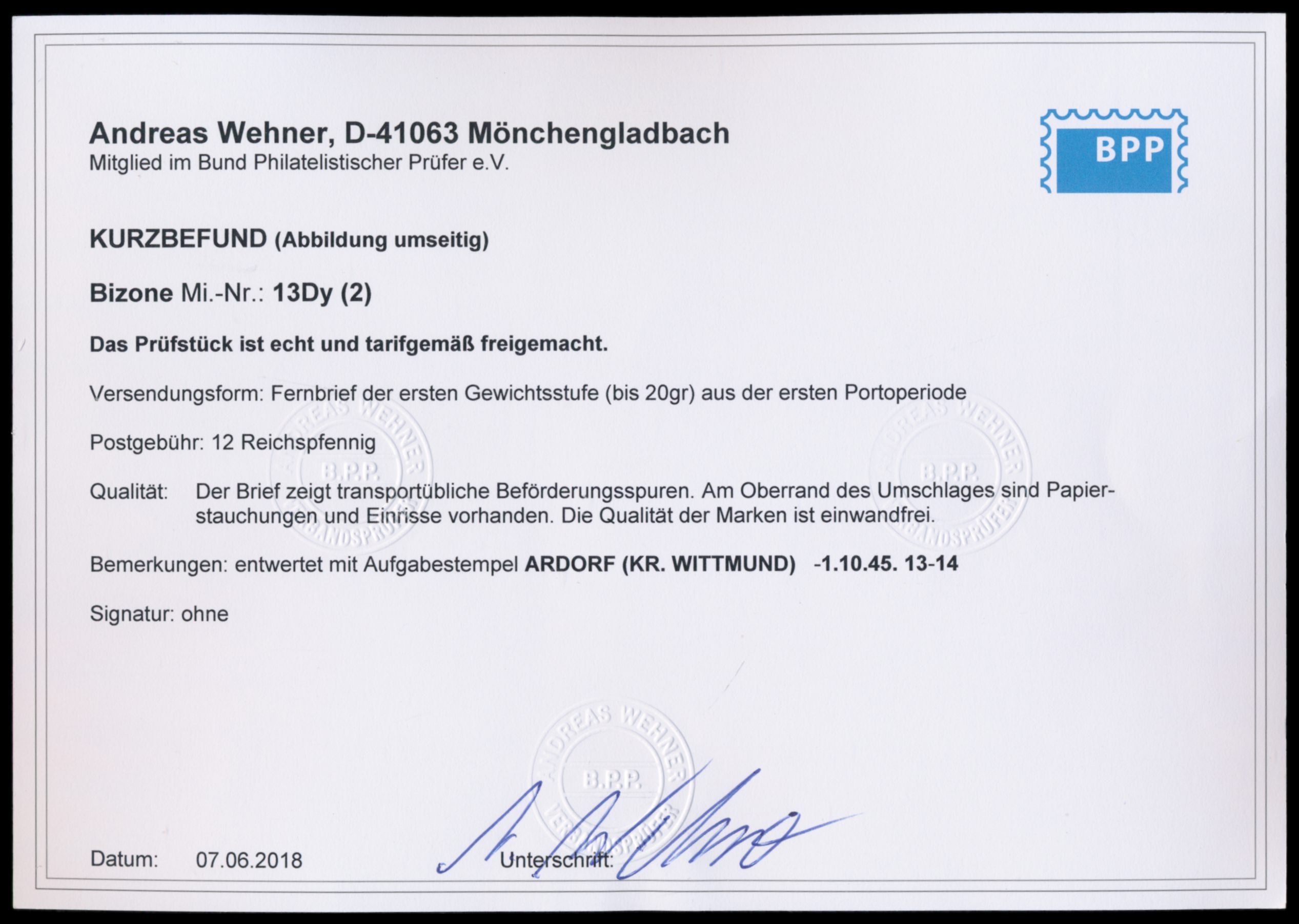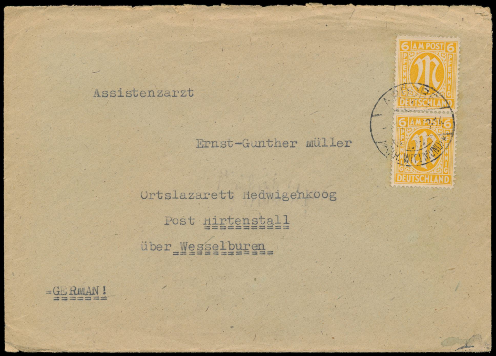 senkrechtes Paar 6 Pf. englischer Druck mit Zähnung 14 1/2 : 14 1/4 auf Brief mit Stempel Adorf (Kr. Wittmund) 1.10.45 nach Hirtenstall, Bedarf, Befund Wehner BPP: Brief Beförderungsspuren, Marken einwandfrei