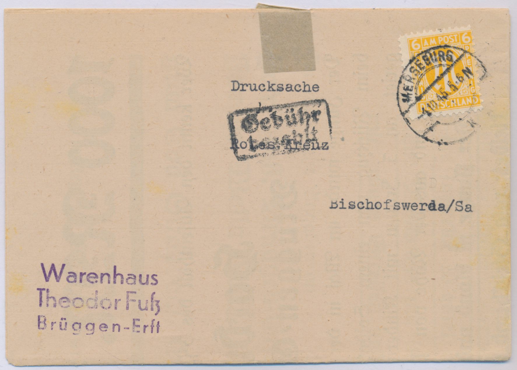 6 Pf. auf Faltdrucksache aus Brüggen-Erft (Britische Zone) an das Rote Kreuz in Bischofswerda / Sachsen, aufgegeben in Merseburg am 4.10.45, zusätzlich R2 Gebühr bezahlt, Grenzgängerpost vor Aufnahme des Interzonen-Postverkehrs, Inhalt Steckbrief, gesucht wird ein Kleinkind das auf der Flucht in "Millowitz (Tschechei)" verloren gegangen ist