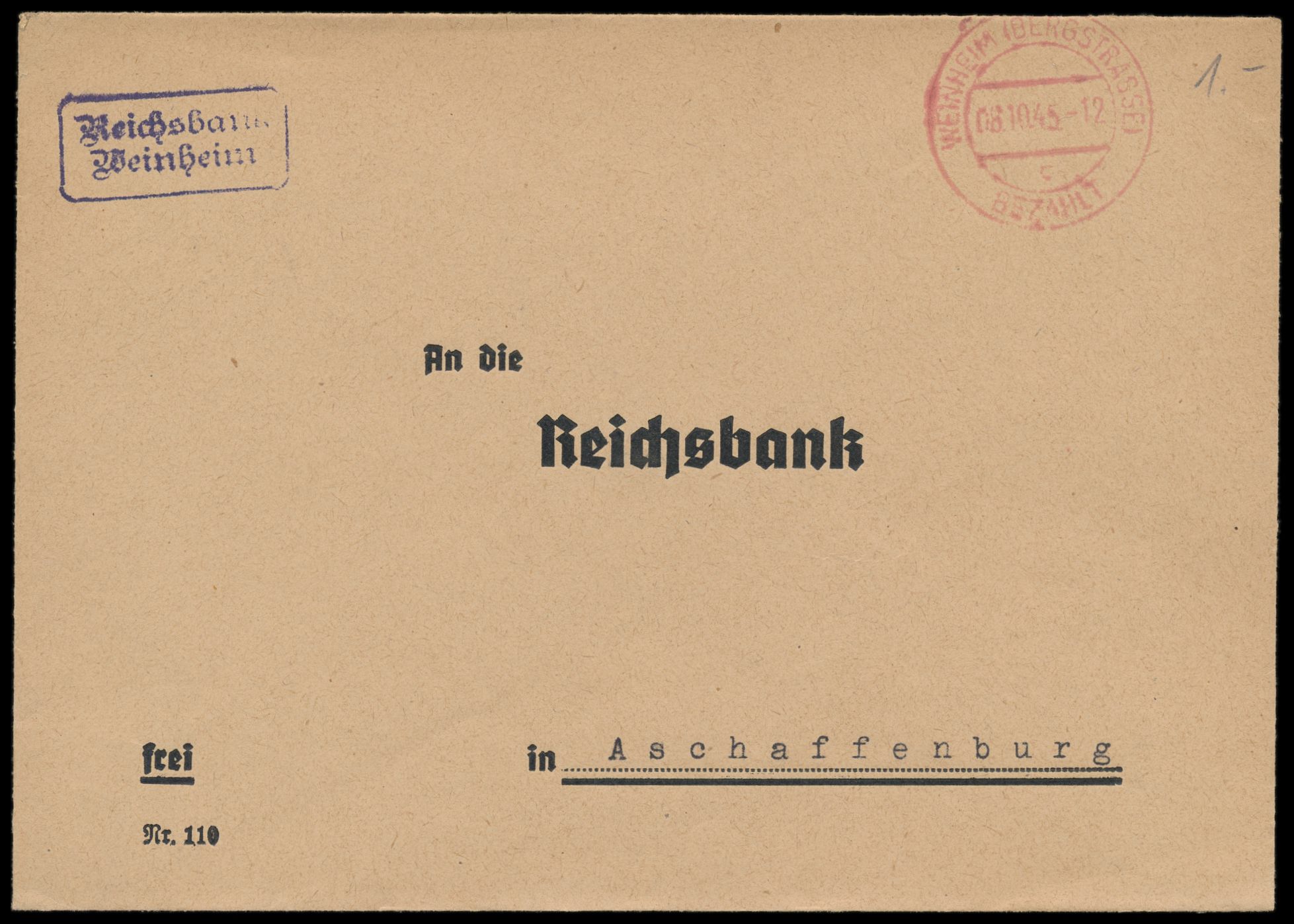 Nord-Baden, unverschlossener Reichsbank-Kurierbrief mit rotem Stempel Weinheim (Bergstrasse) Bezahlt 8.10.45 an die Reichsbank in Aschaffenburg, handschriftliche Gebührenangabe 1 RM