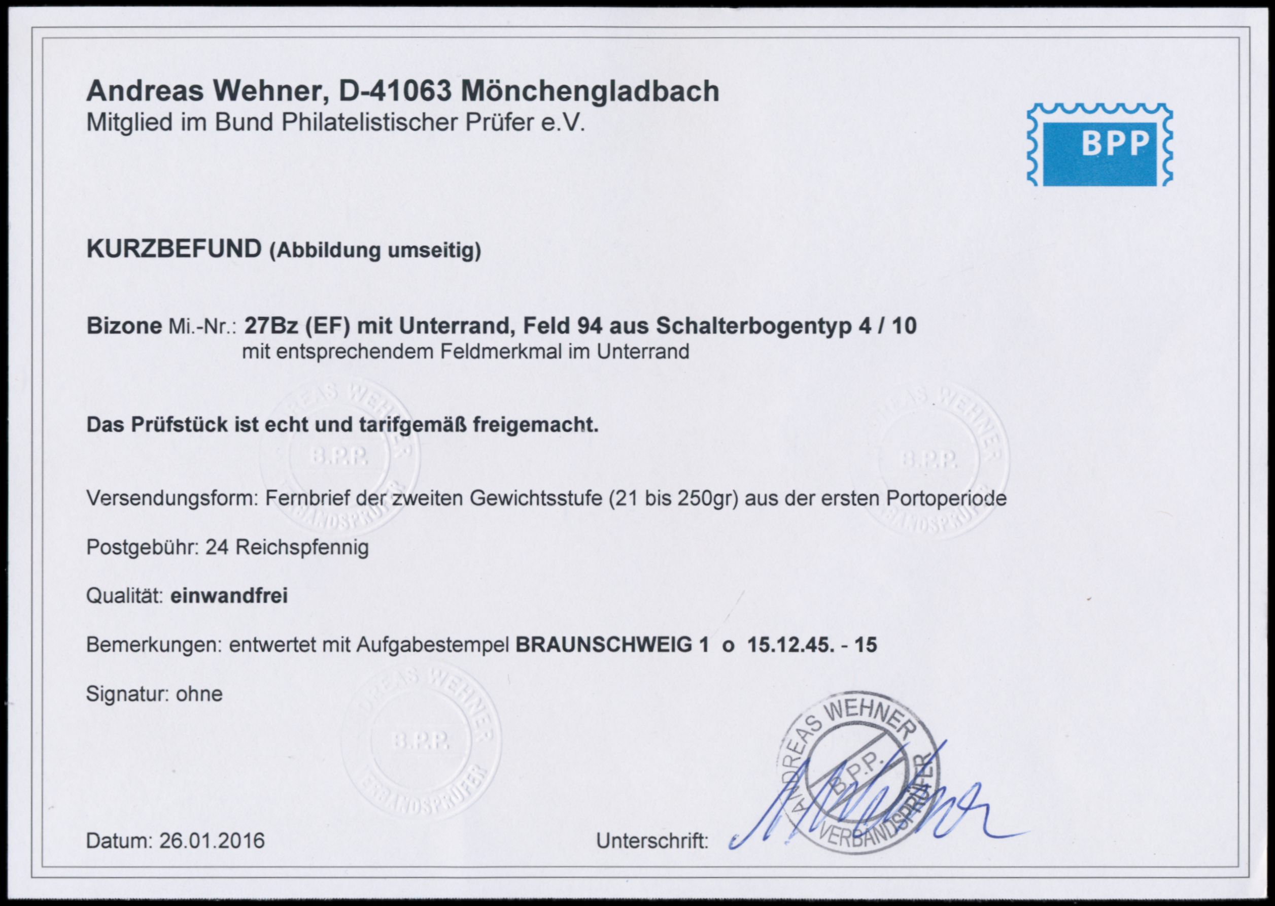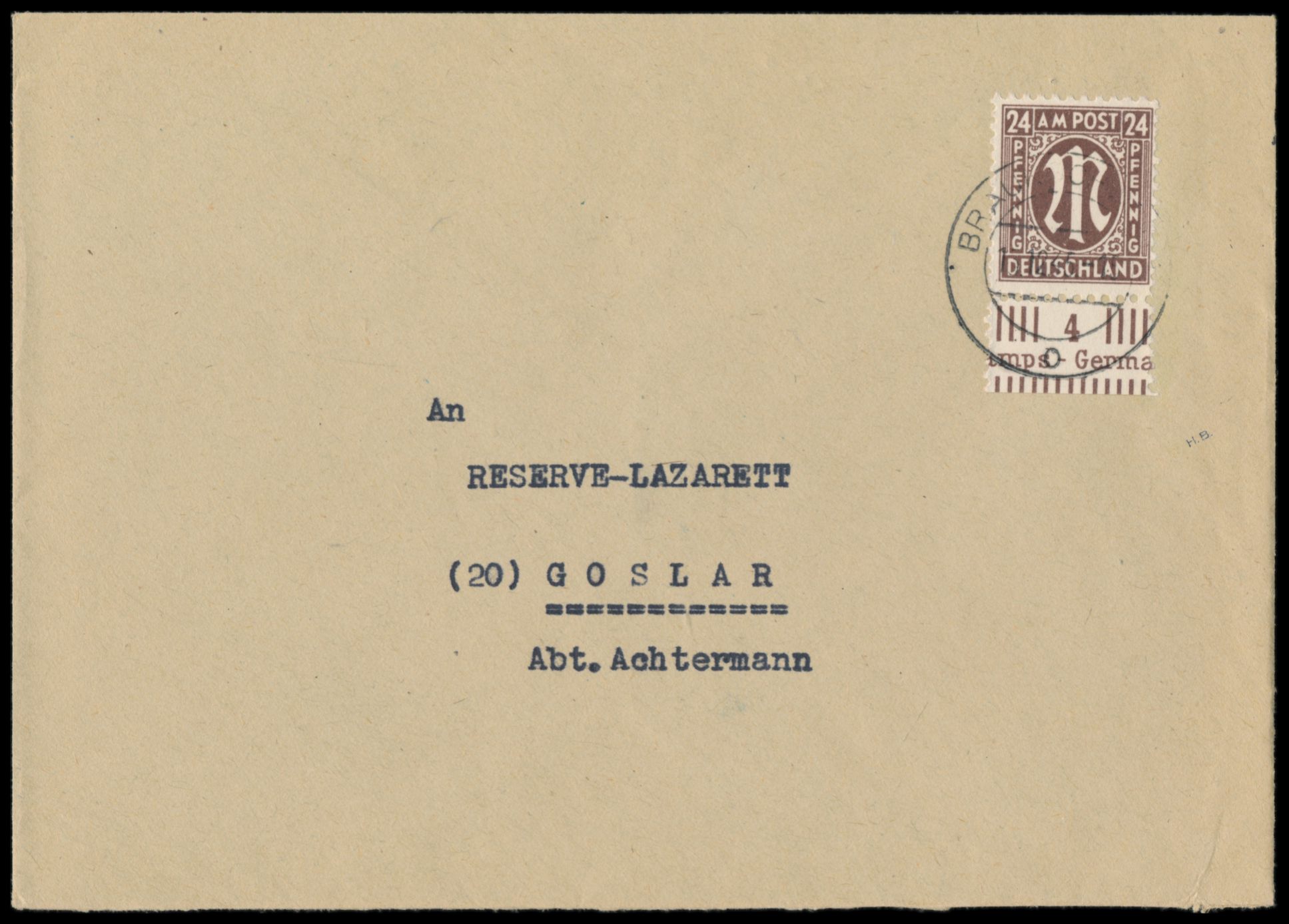 Einzelfrankatur 24 Pf. mit Zähnung 11 : 11 1/2 mit Unterrand auf Brief 2. Gewicht, Stempel Braunschweig 1 15.12.45, nach Goslar, seltene Verwendung in der 1. Portoperiode, Bedarf, Befund Wehner BPP: portorichtig und einwandfrei