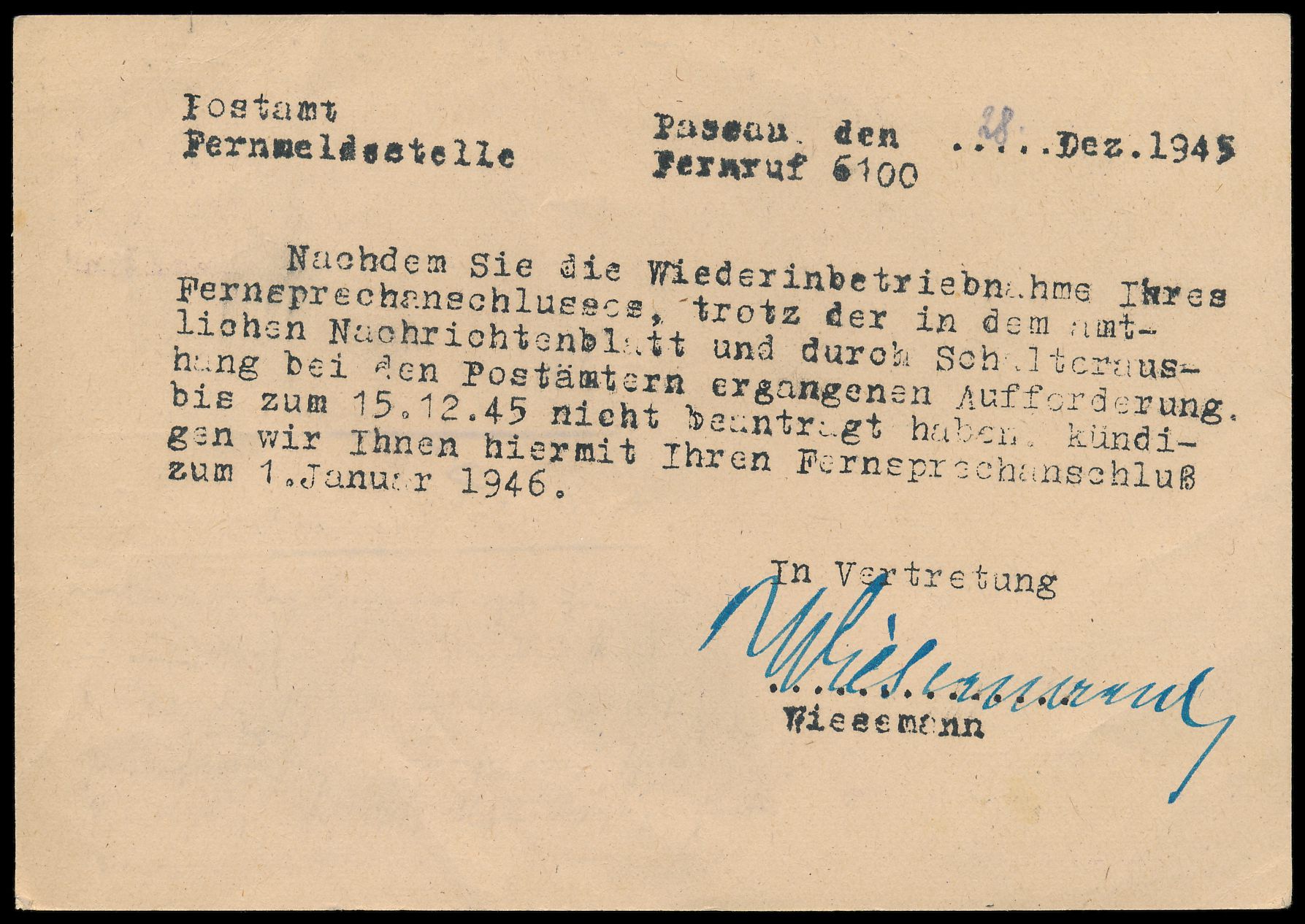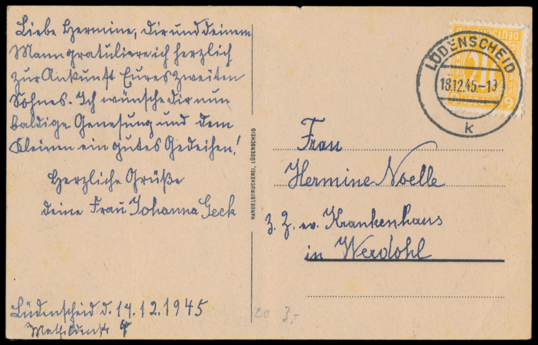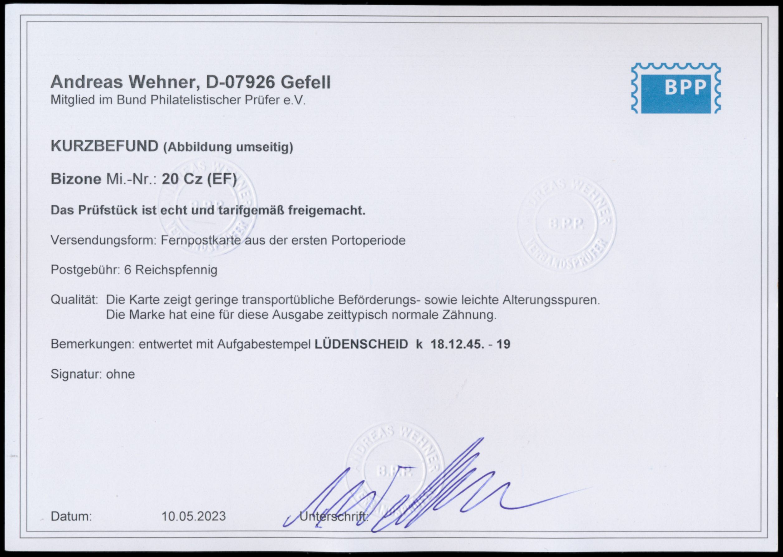 Einzelfrankatur 6 Pf. deutscher Druck mit besserer Zähnung 11 1/2 : 11 auf Postkarte, Stempel Lüdenscheid 18.12.45, nach Werdohl, Bedarf, Befund Wehner BPP: leichte Alterungsspuren, Marke zeittypische normale Zähnung