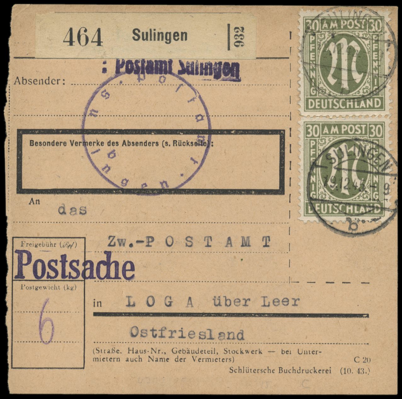 senkrechtes Paar 30 Pf. (bessere Zähnung 11 1/2 : 11) auf Paketkarte von Sulingen 19.12.45 nach Loga über Leer, Absenderstempel und aptiertes Dienstsiegel Postamt Sulingen, rückseitig PSt II-Stempel Loga über Leer (Ostfriesland) und handschriftlicher Zustellvermerk 22.12.45, Paketkarten in der Britischen Zone vor dem 1.3.1946 sind sehr selten