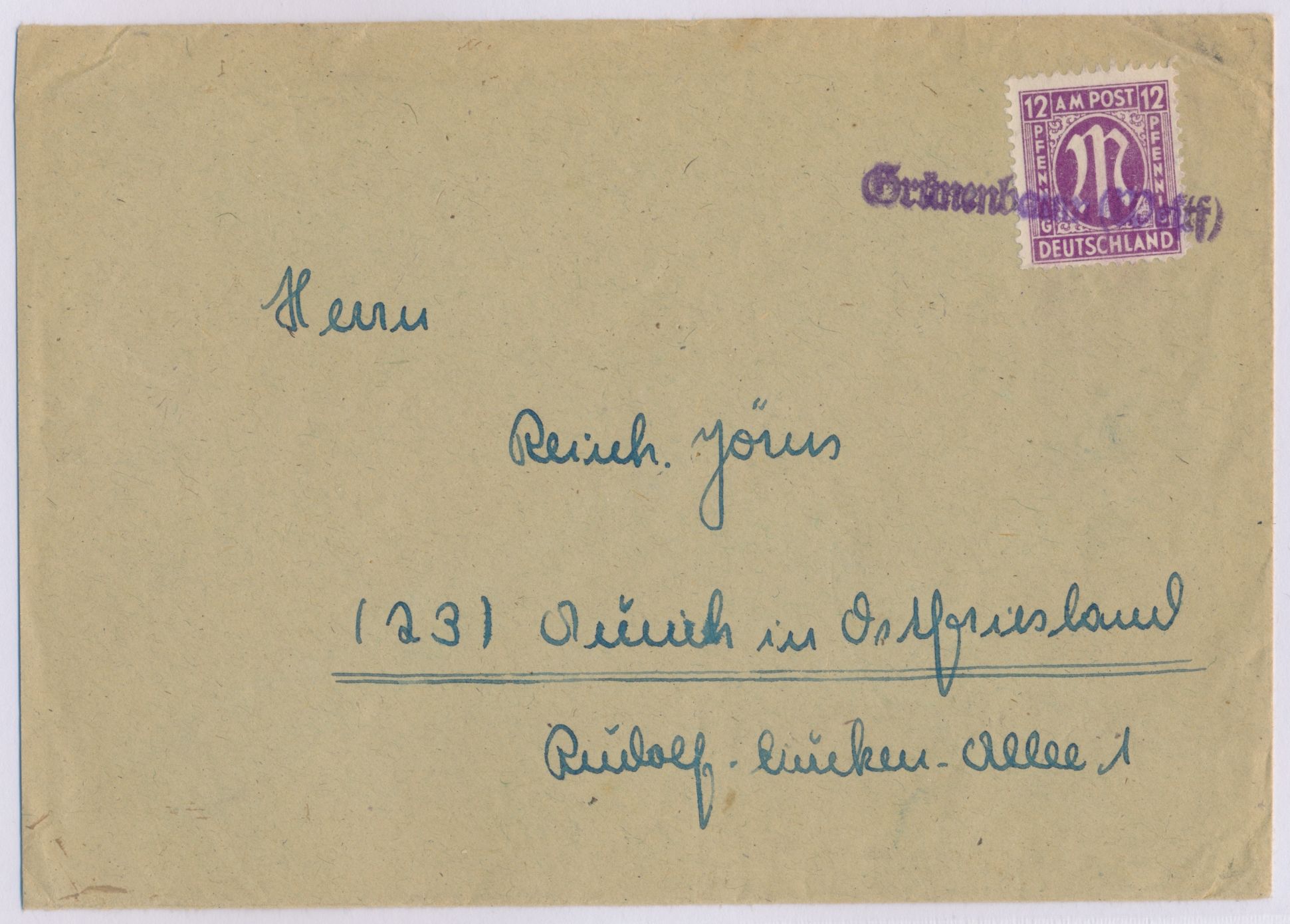 violetter Not-L1 Grünenbaum (Westf) auf Brief mit 12 Pf. AM-Post nach Aurich, Bedarf, Handbuch Typ a = Gruppe 3