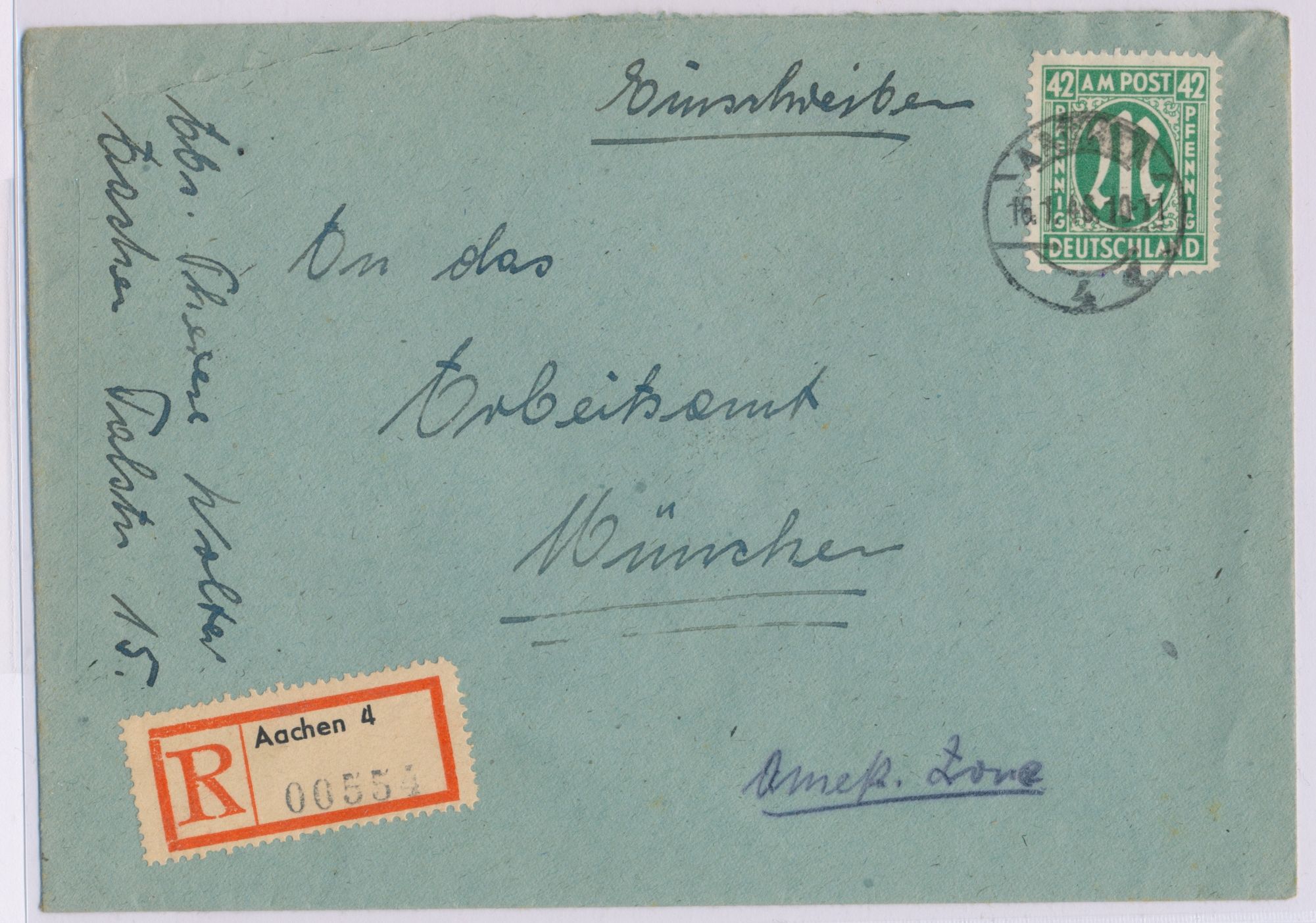 Einzelfrankatur 42 Pf. auf Einschreibbrief mit Stempel Aachen 4 16.1.46 nach München, R-Zettel-Amtsausgabe von Aachen, Ankunftstempel 22.1.46, Bedarf
